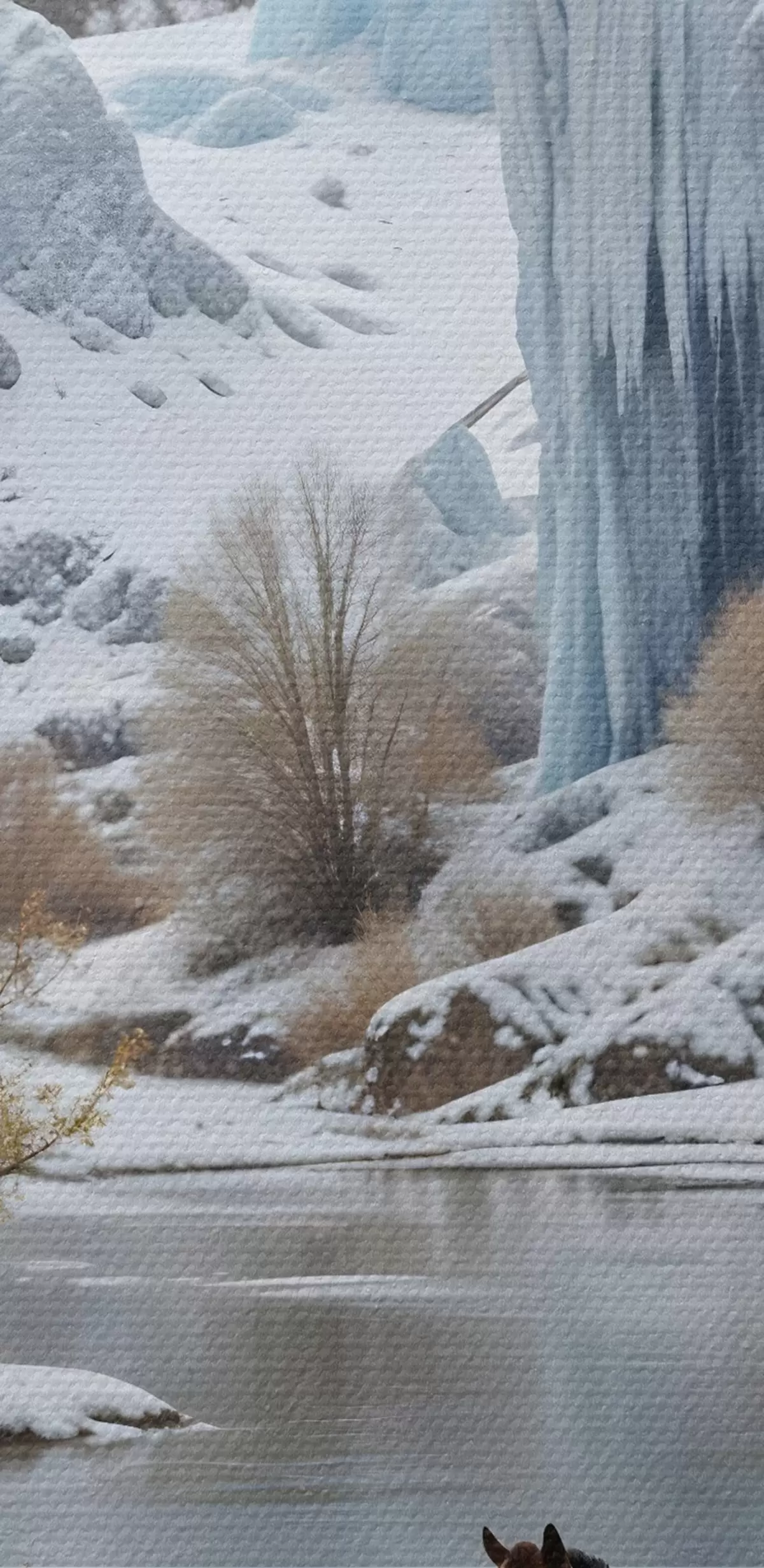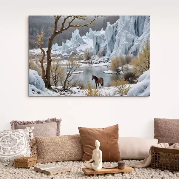 Cuadros Un paisaje invernal nevado con un lago helado, imponentes acantilados de hielo y un caballo de pie en primer plano Nr s41716