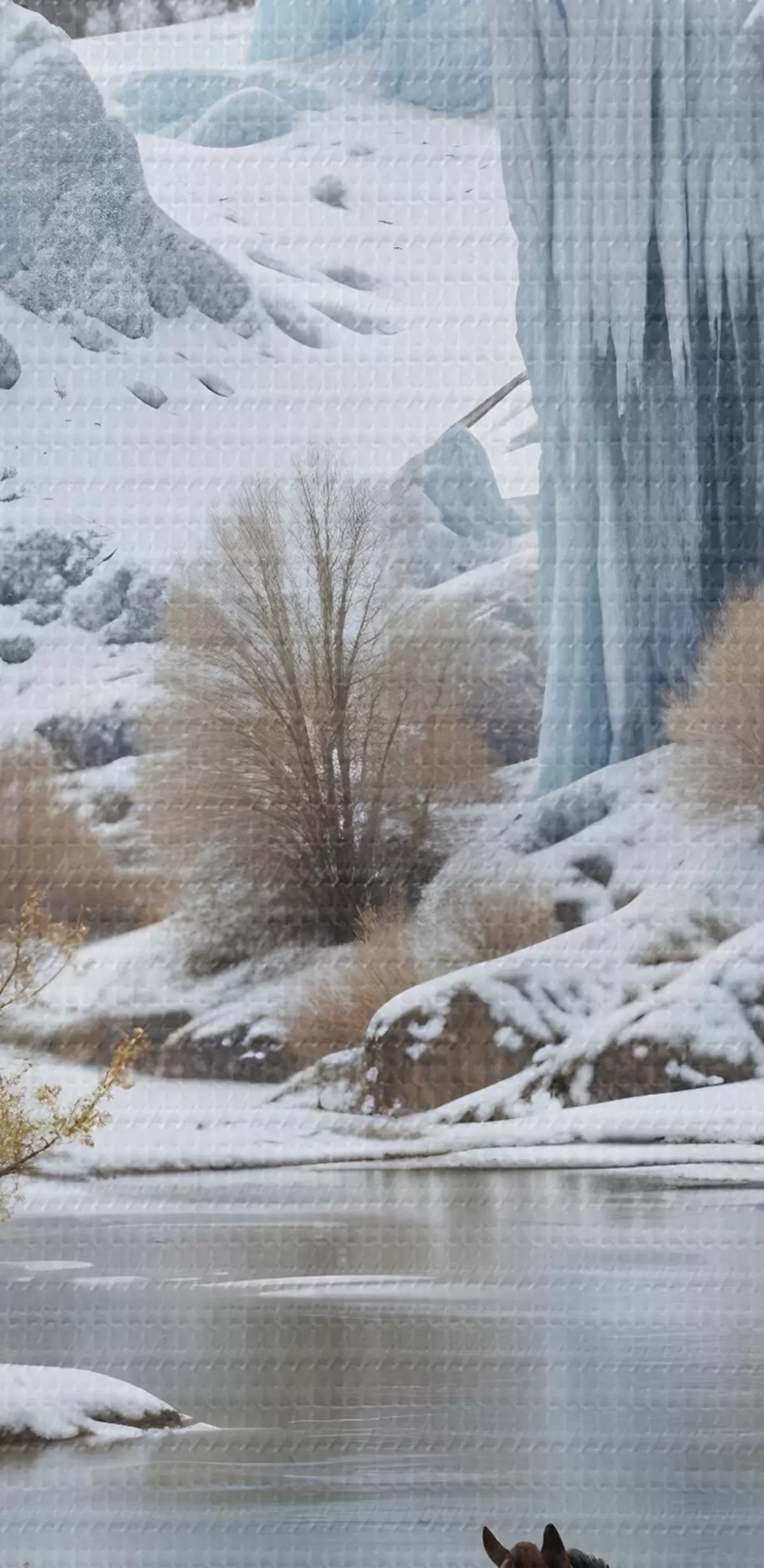 murales de pared Un paisaje invernal nevado con un lago helado, imponentes acantilados de hielo y un caballo de pie en primer plano s41716