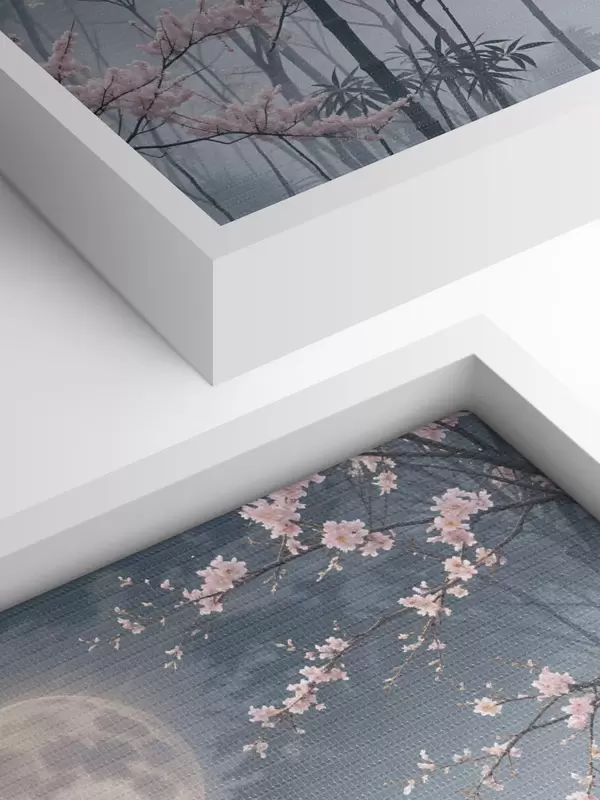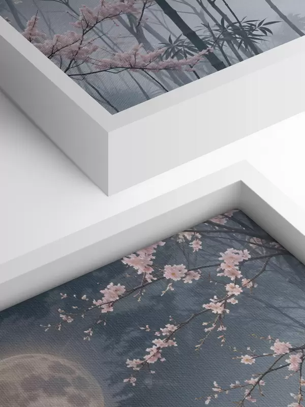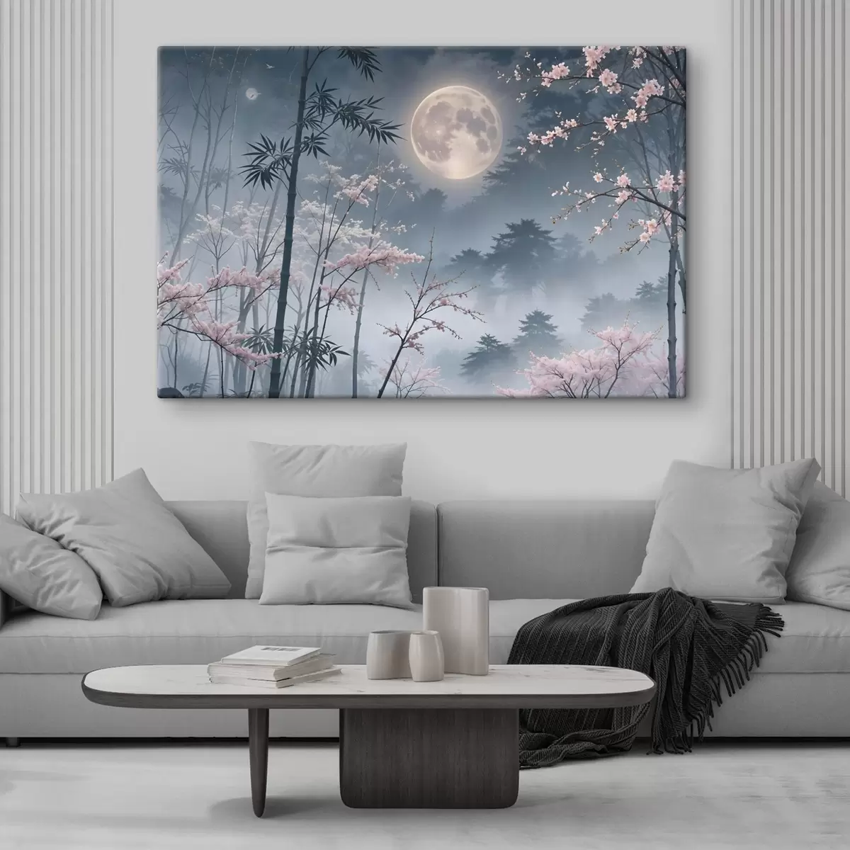 Cuadros Una luna llena en un cielo nocturno, rodeada de siluetas de bambú y ramas de cerezo en flor Nr s41717