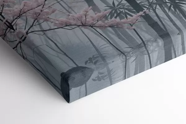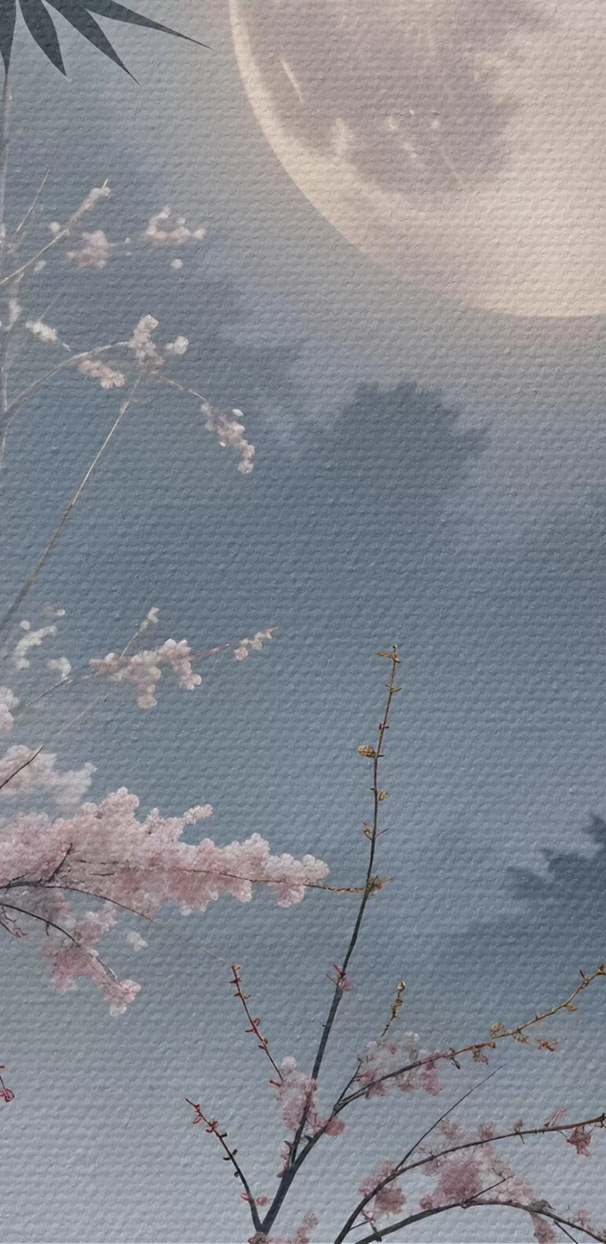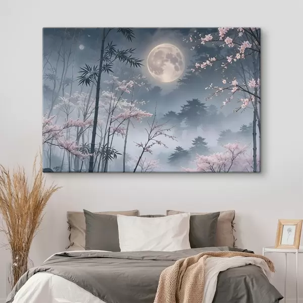 Cuadros Una luna llena en un cielo nocturno, rodeada de siluetas de bambú y ramas de cerezo en flor Nr s41717