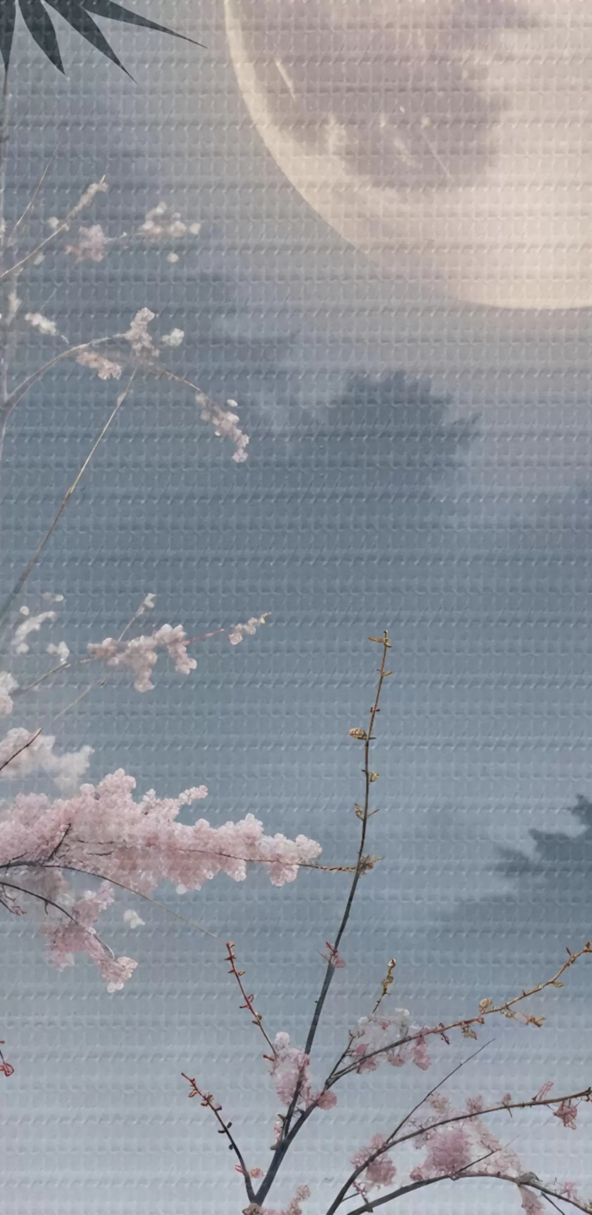 murales de pared Una luna llena en un cielo nocturno, rodeada de siluetas de bambú y ramas de cerezo en flor  s41717
