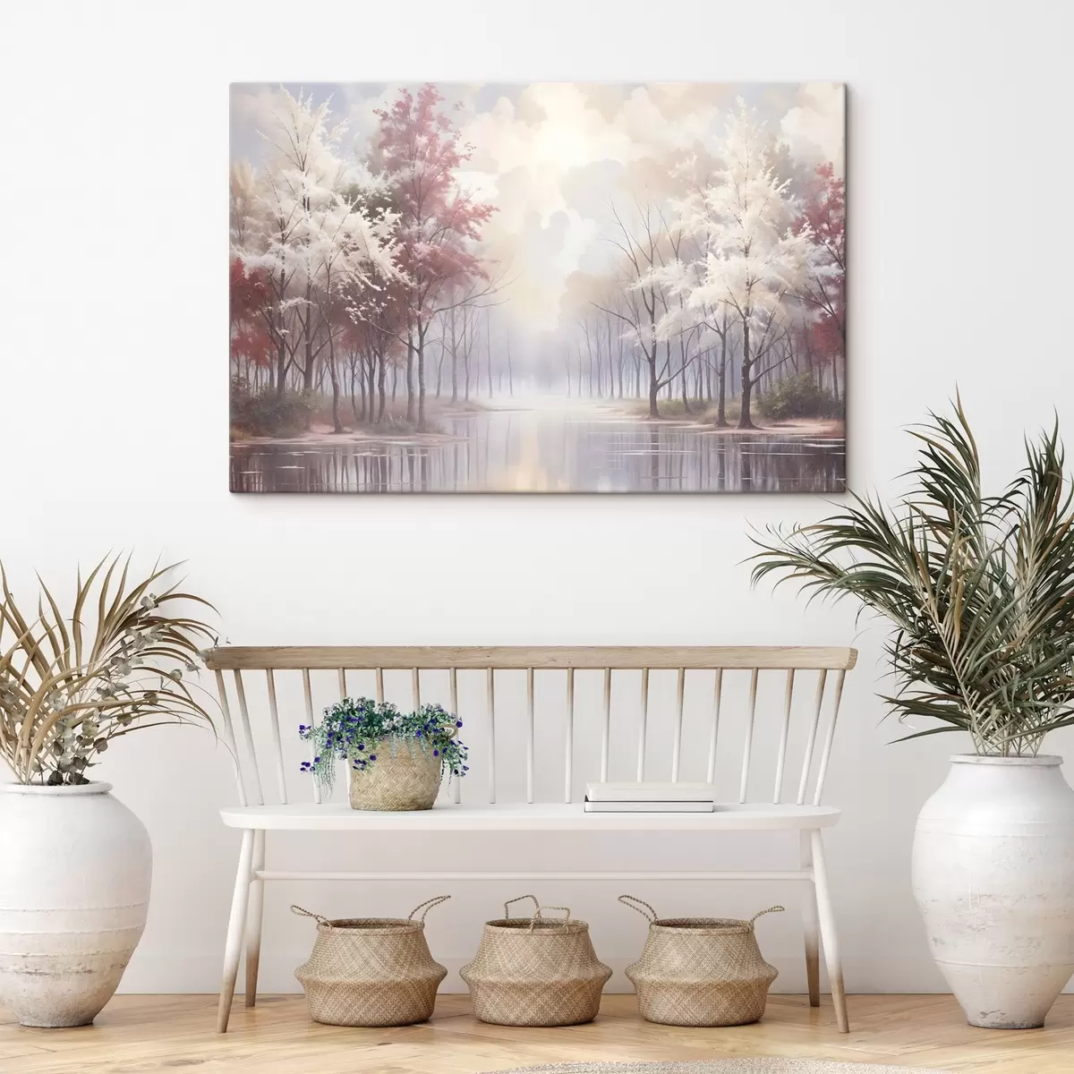 Cuadros Un paisaje sereno con un bosque brumoso, árboles desnudos y un lago tranquilo que refleja los suaves tonos rosas y blancos Nr s41720