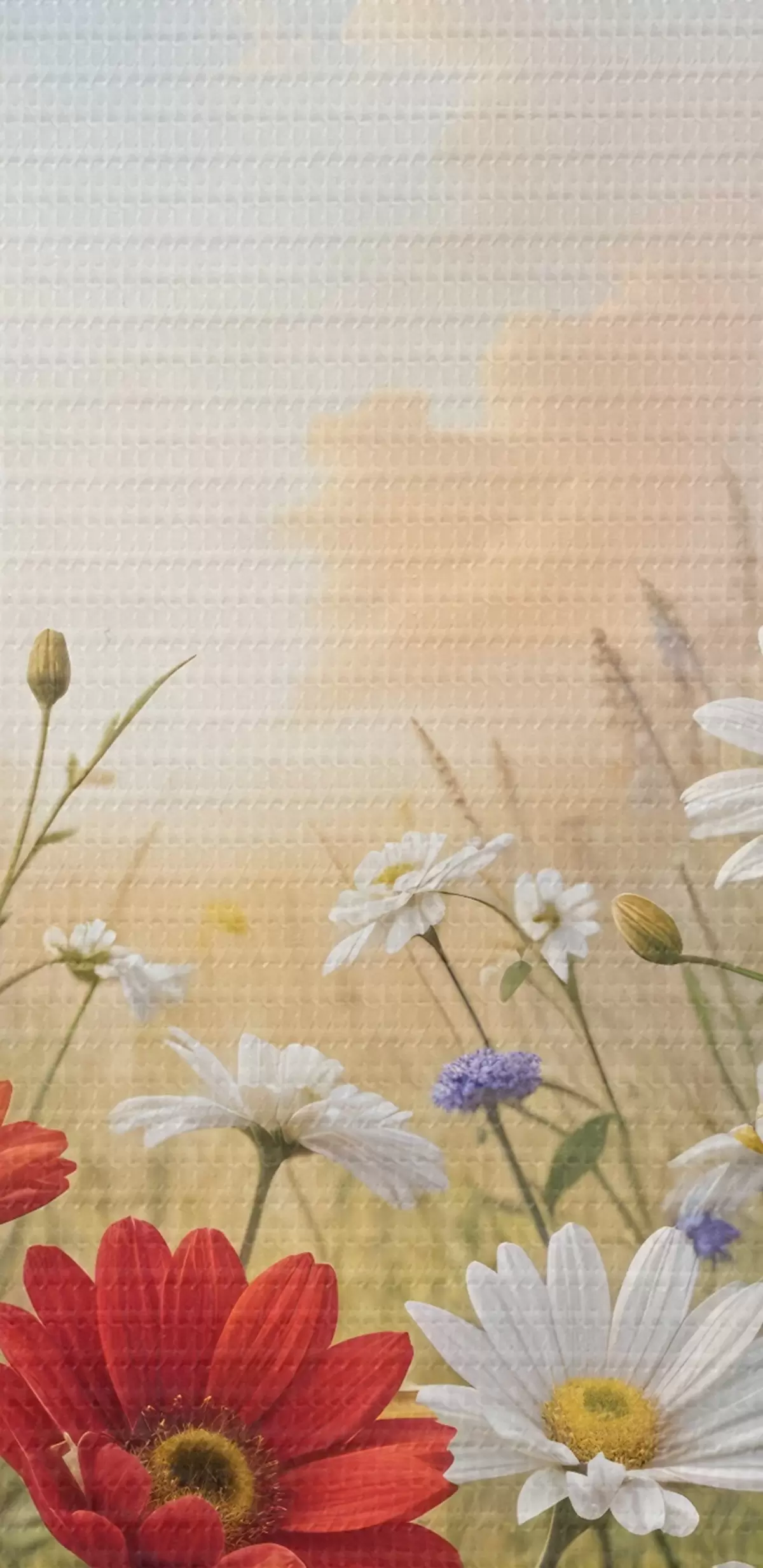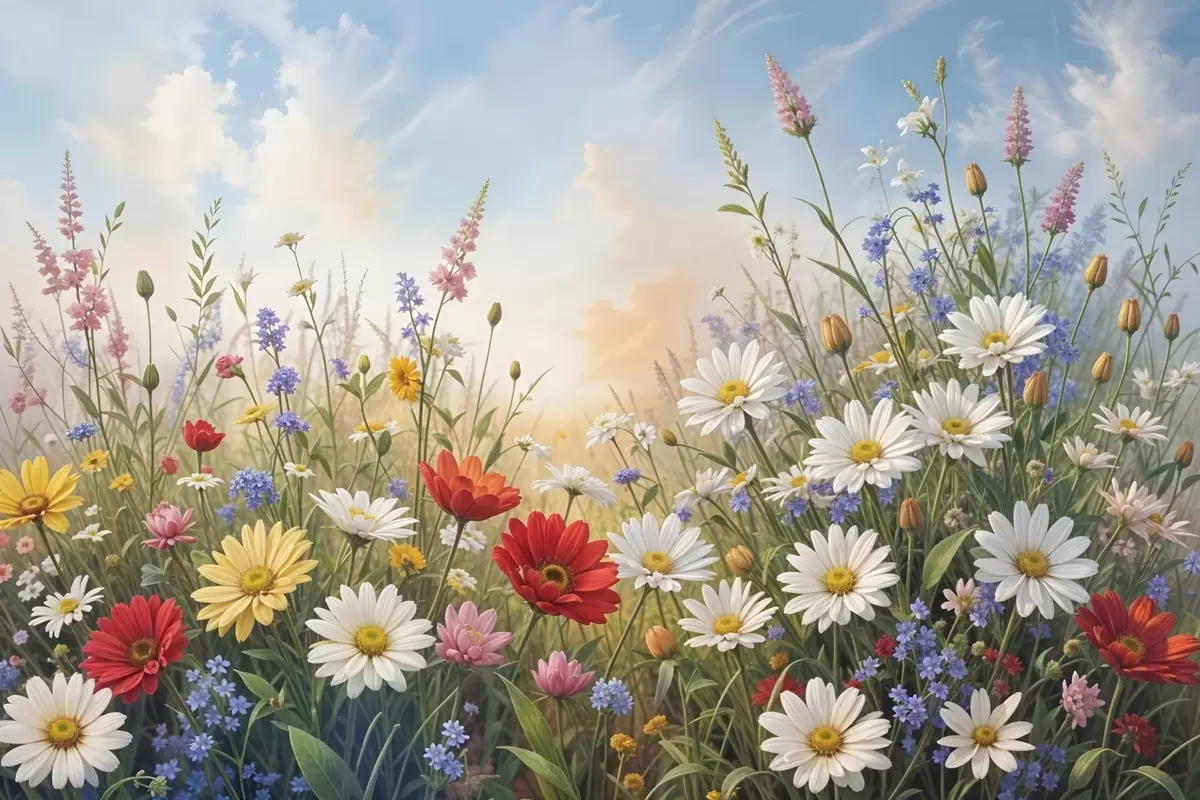 murales de pared Un campo de coloridas flores silvestres que incluye margaritas, amapolas y otras plantas en flor contra un cielo azul  s41725