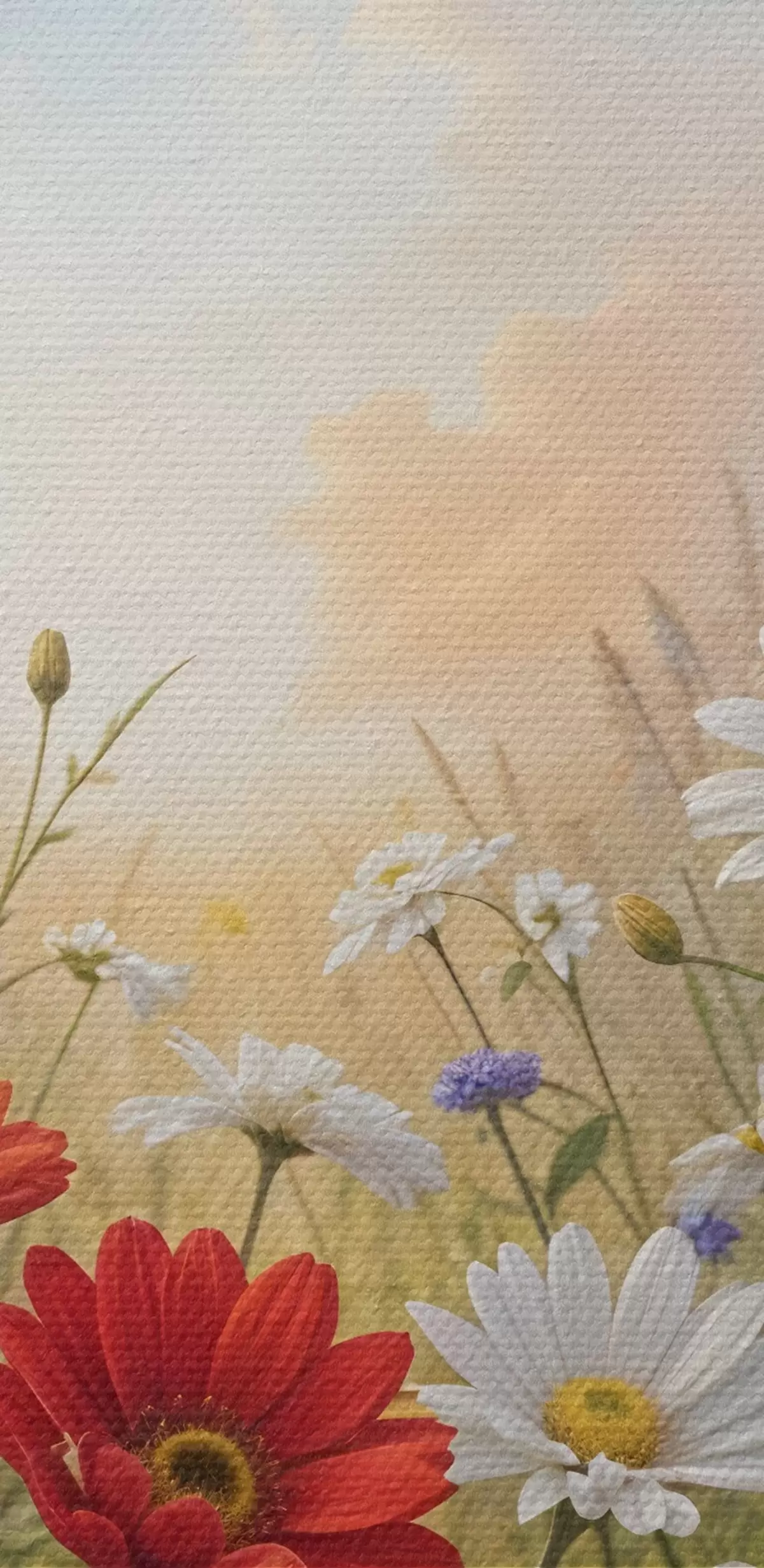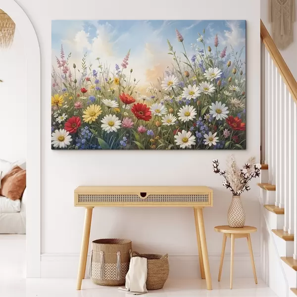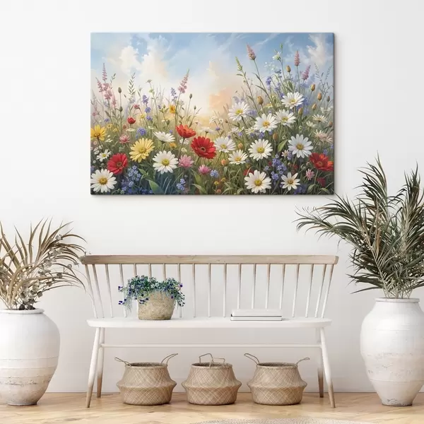 Cuadros Un campo de coloridas flores silvestres que incluye margaritas, amapolas y otras plantas en flor contra un cielo azul Nr s41725