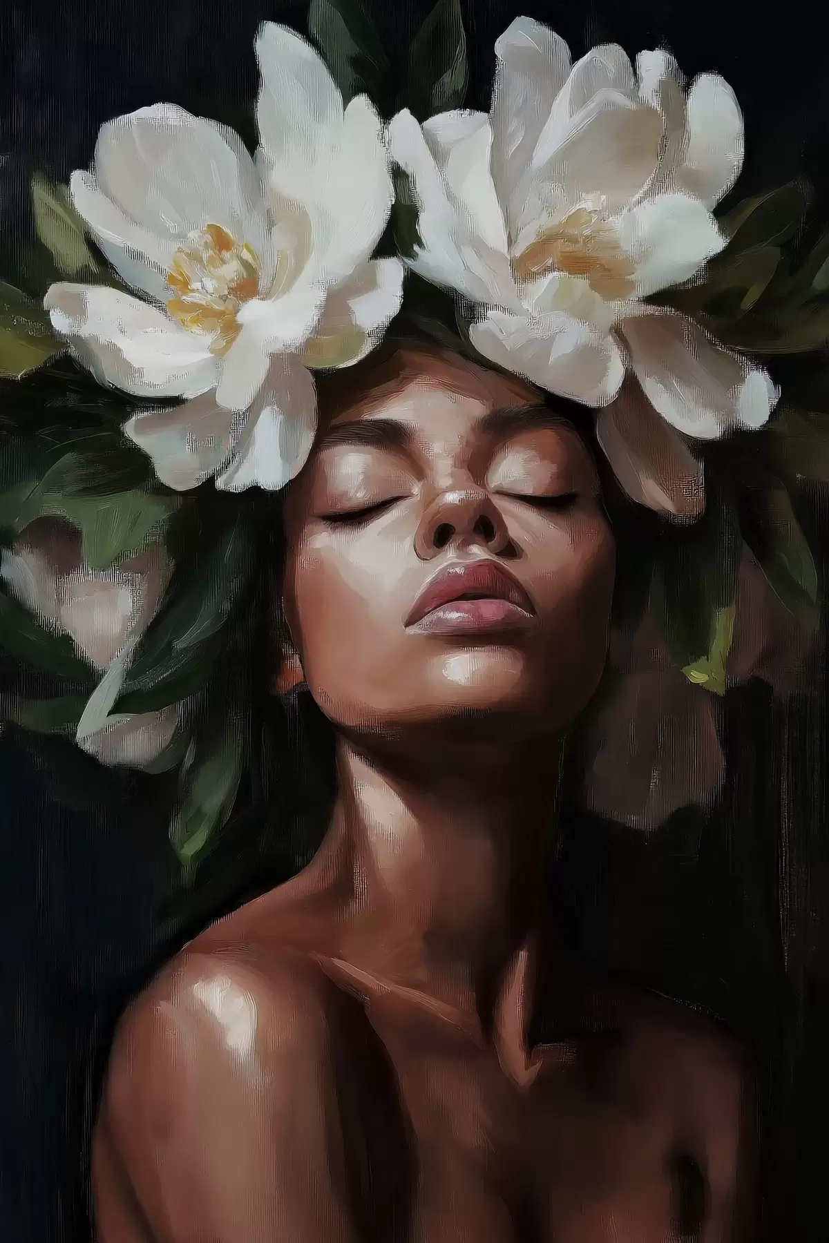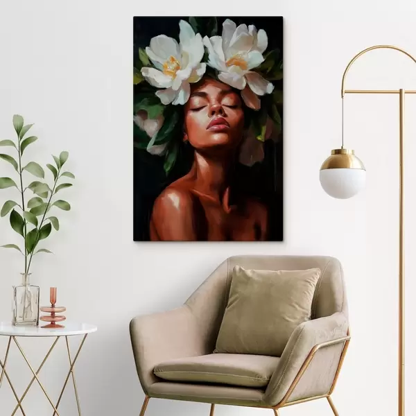 Cuadros Retrato femenino con flores blancas en el pelo sobre fondo oscuro Nr s41824