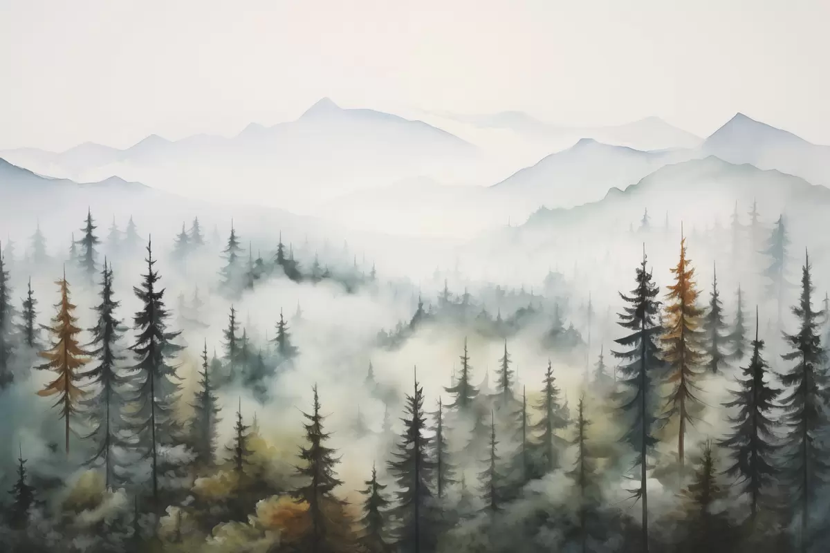 murales de pared Bosque sobre el fondo de las montañas en la niebla imitación de acuarela s41935