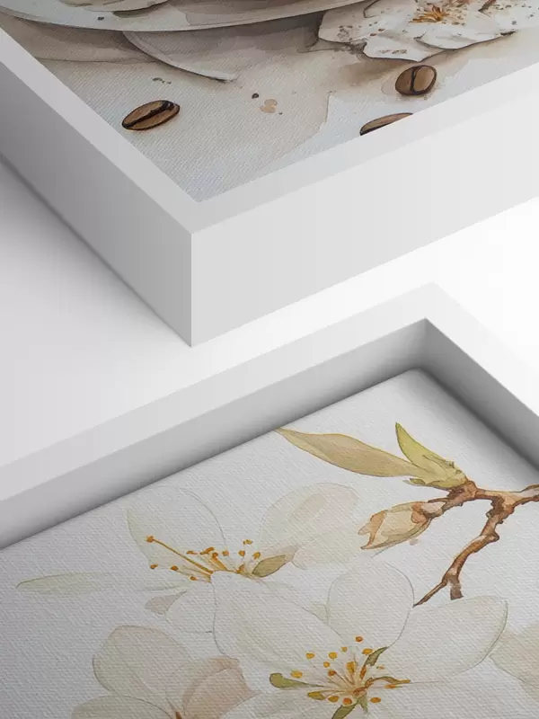 Cuadros Taza de café con macarrones, estilo acuarela, colores suaves, flores de jazmín Nr s41949