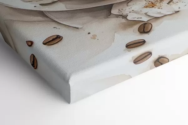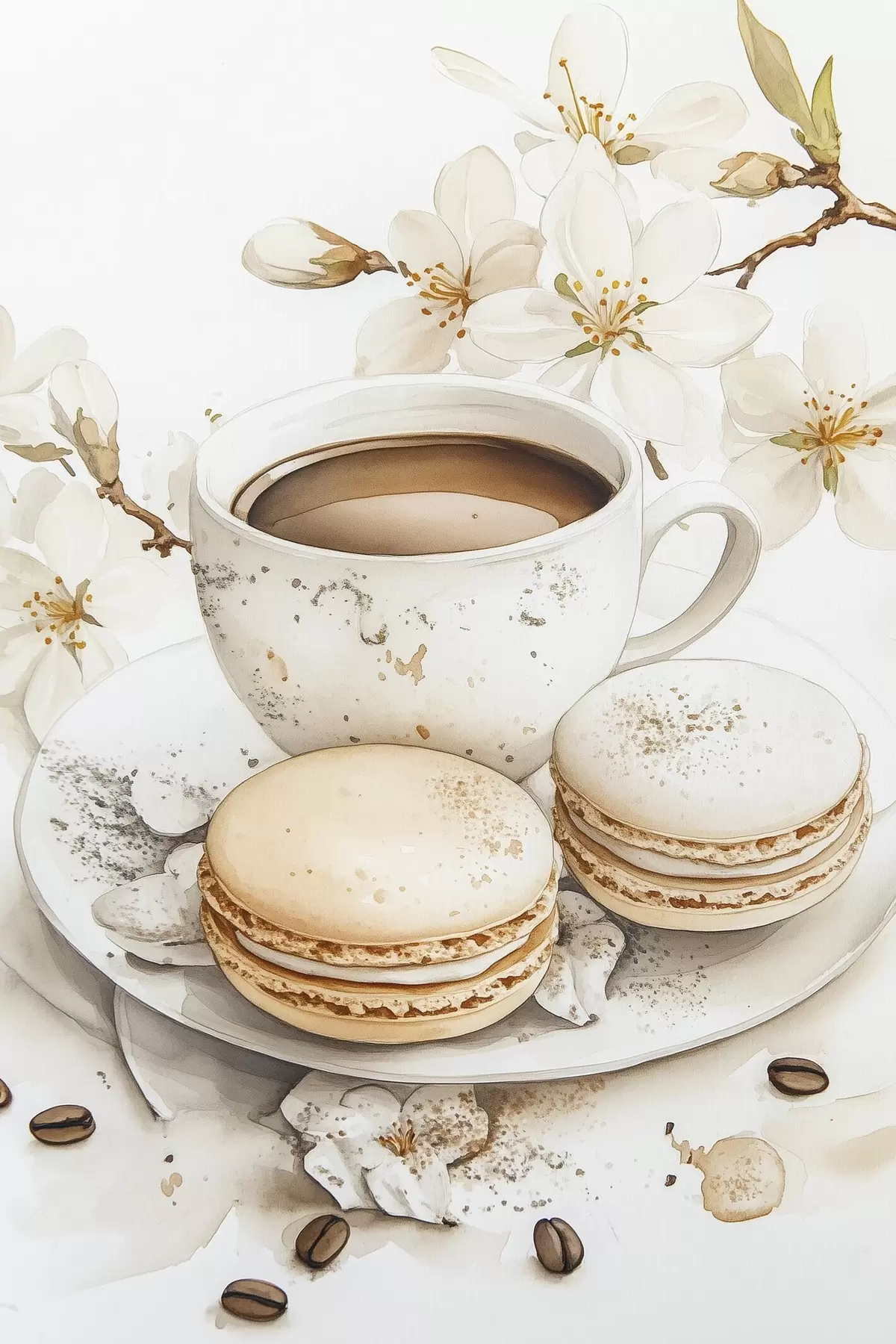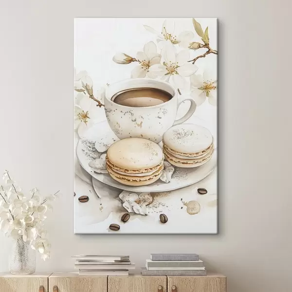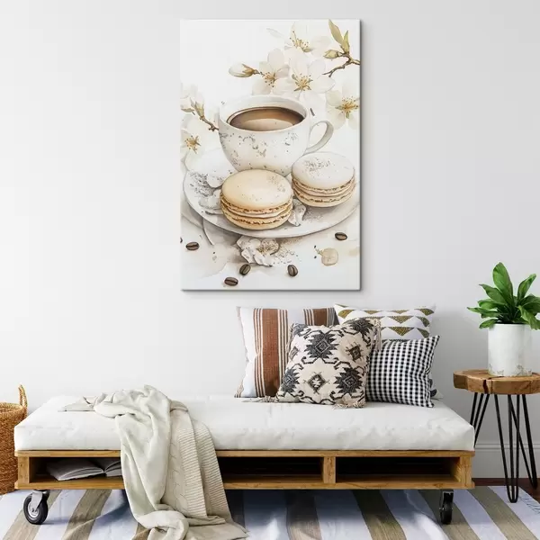 Cuadros Taza de café con macarrones, estilo acuarela, colores suaves, flores de jazmín Nr s41949