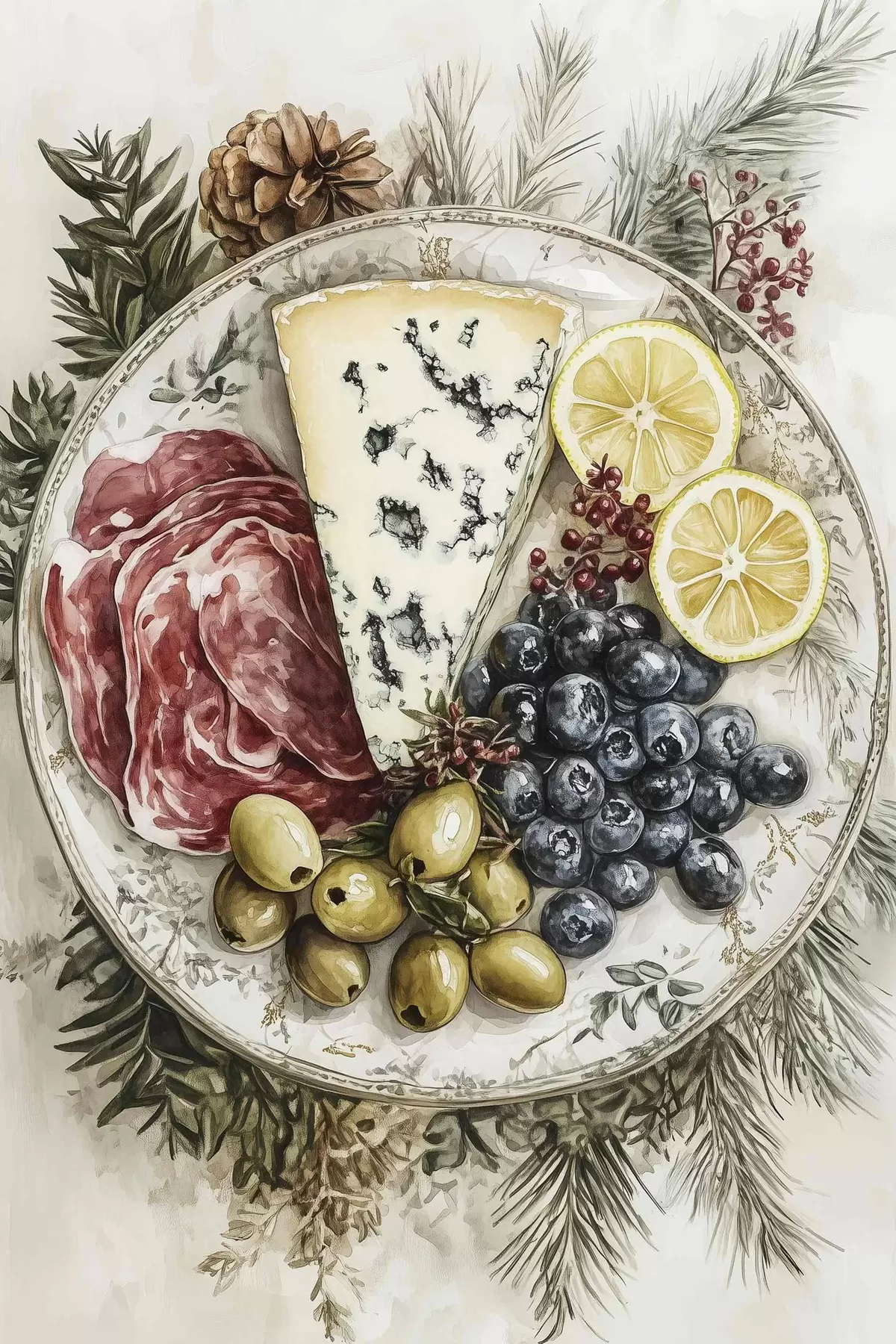 murales de pared Plato festivo con queso azul, aceitunas, jamón, limones y arándanos, comida estilo acuarela s41960
