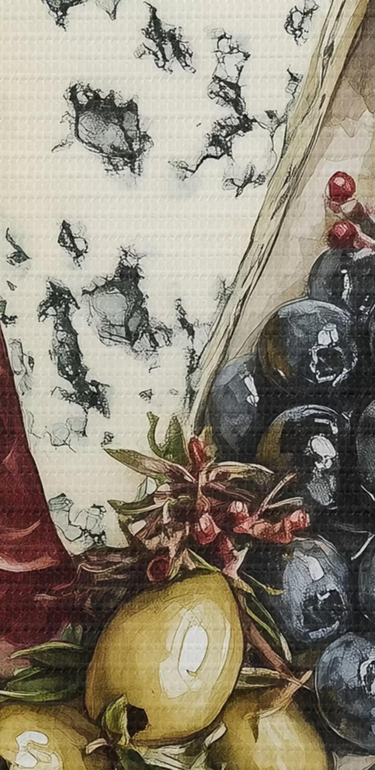Cuadros Plato festivo con queso azul, aceitunas, jamón, limones y arándanos, comida estilo acuarela Nr s41960