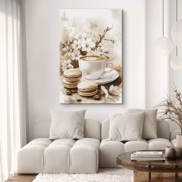 Cuadros Macarrones, taza de café, estilo acuarela, colores beige, flores de jazmín Nr s41965