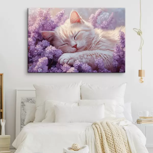 Cuadros gato tumbado sobre flores moradas Nr s42012