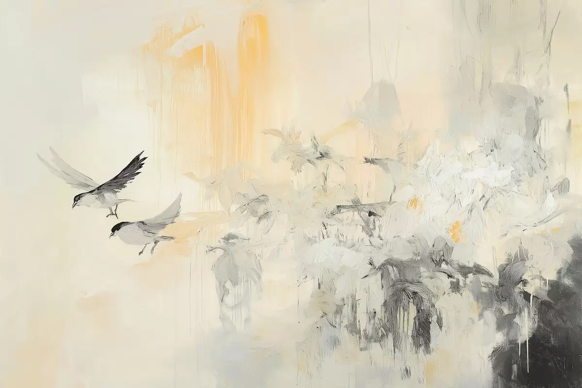 murales de pared Abstracción con pájaros, estilo acrílico, colores gris y beige s42206