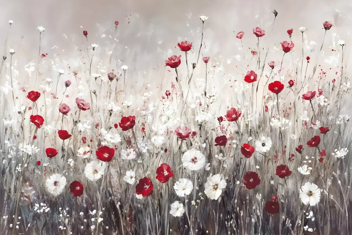 Cuadros Imitación abstracta al óleo de un campo de flores rojas y blancas de amapolas y margaritas sobre un fondo gris texturado Nr s42213
