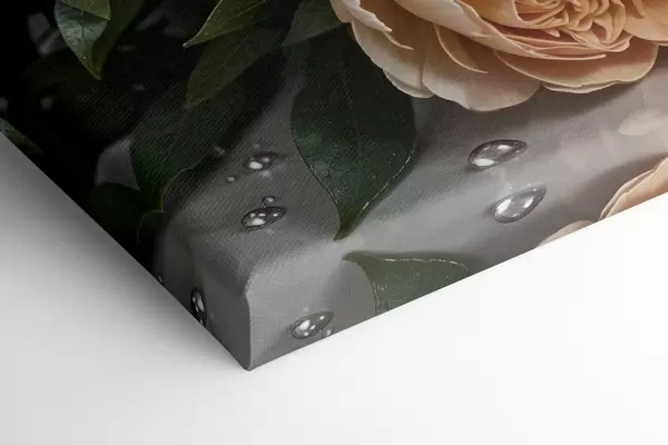 Cuadros Flores de peonía detalladas de color crema con hojas verde oscuro sobre fondo gris Nr s42215