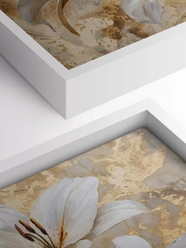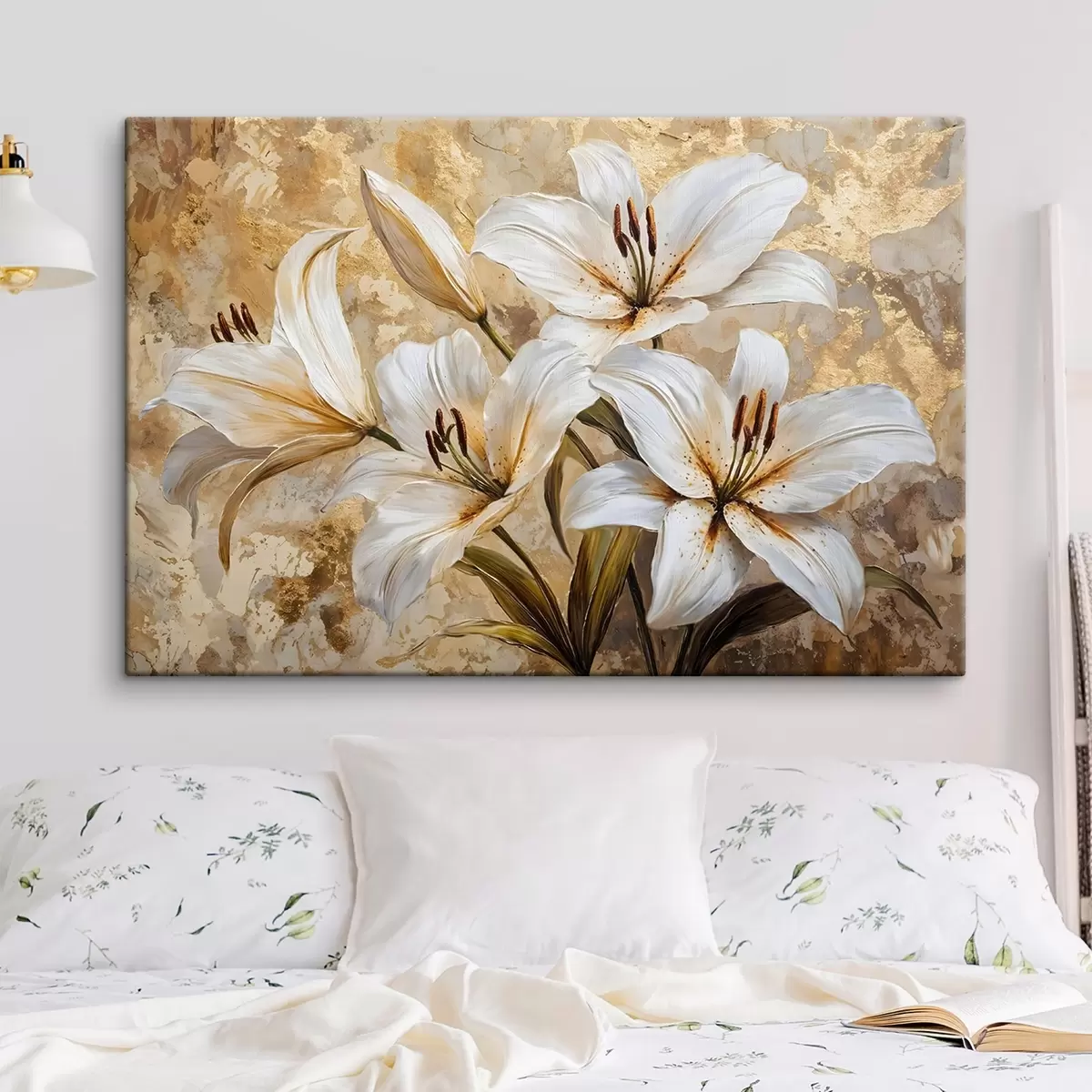 Cuadros Lirios blancos con centros amarillos sobre un fondo beige texturado Nr s42216