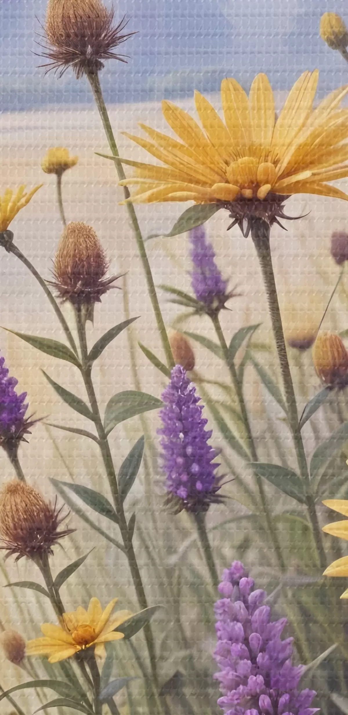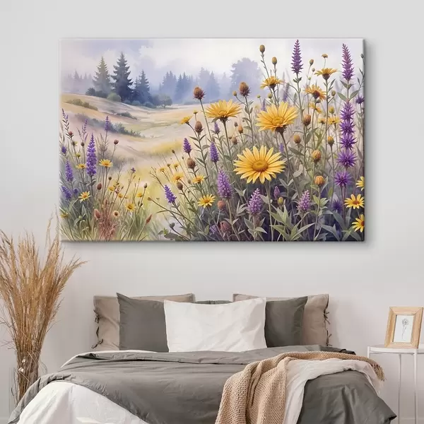 Cuadros Un campo de girasoles amarillos y flores silvestres púrpuras en un paisaje forestal brumoso con pinos al fondo Nr s42223