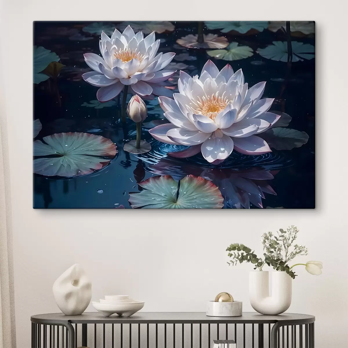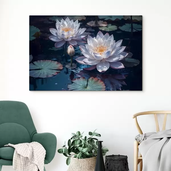Cuadros Flores de loto blancas flotando en un estanque tranquilo con nenúfares Nr s42225