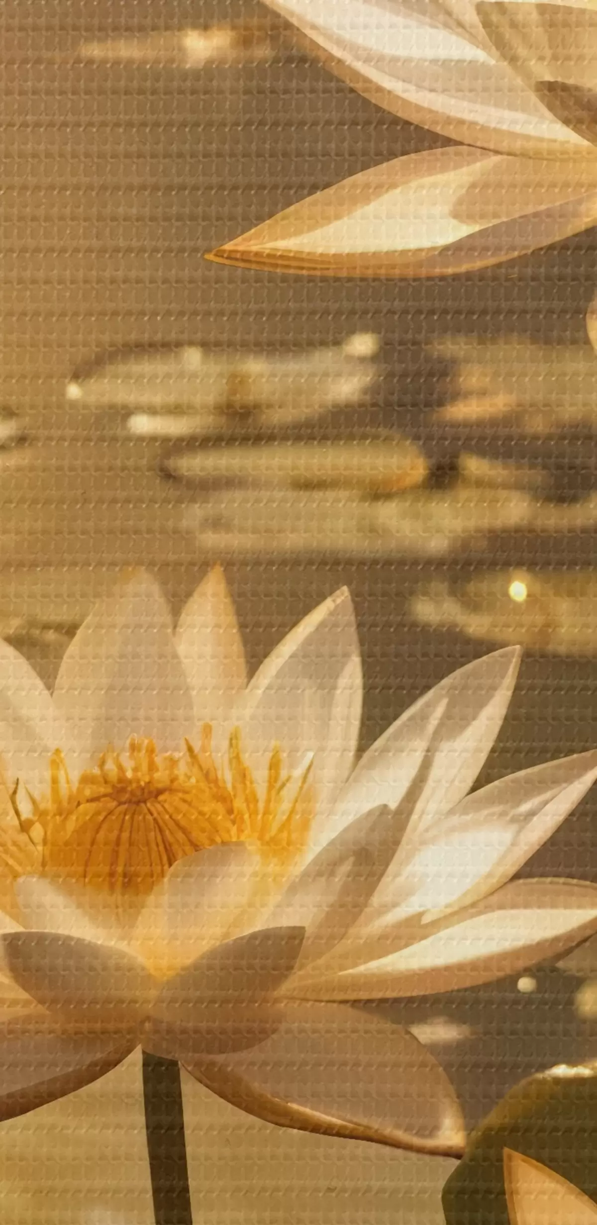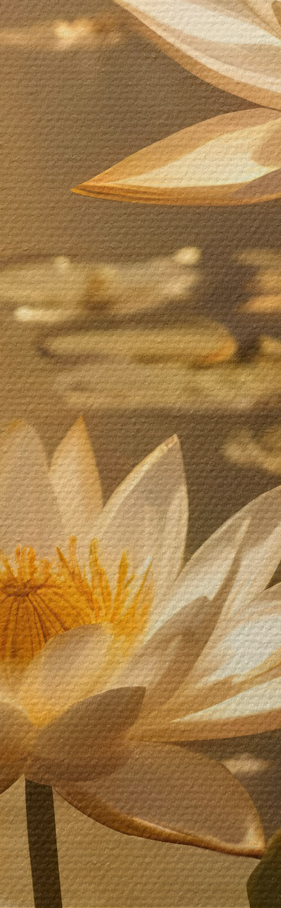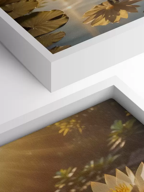 Cuadros Flores de loto blancas flotando en un estanque en calma con el sol, creando un ambiente sereno y tranquilo Nr s42239