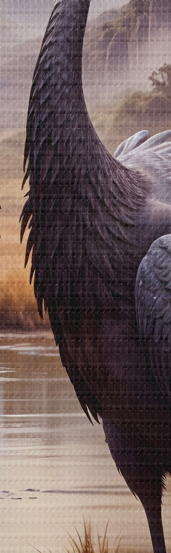 Cuadros Dos grandes grullas negras de pie en un estanque poco profundo , con un paisaje montañoso de fondo Nr s42240