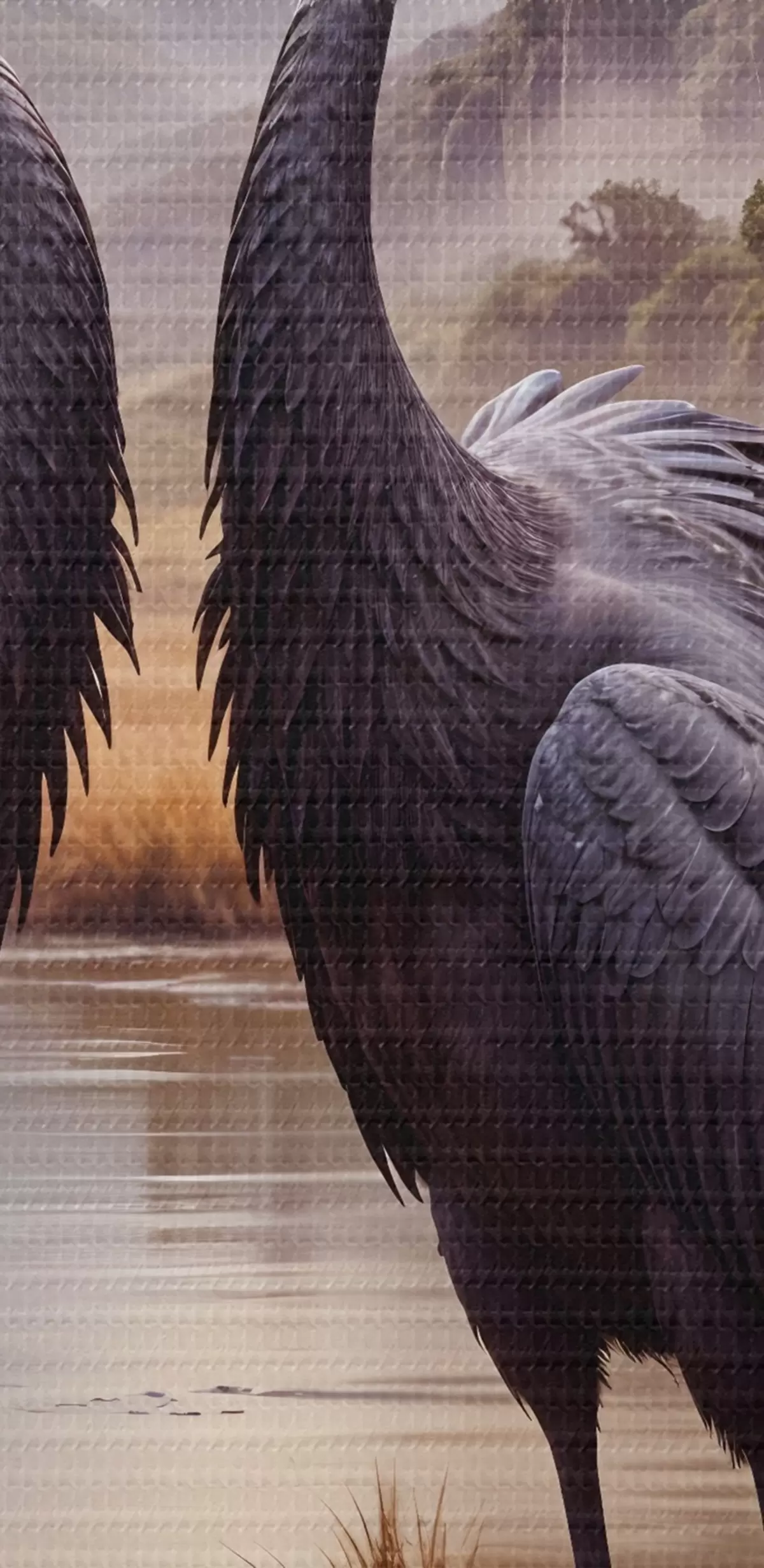Cuadros Dos grandes grullas negras de pie en un estanque poco profundo , con un paisaje montañoso de fondo Nr s42240