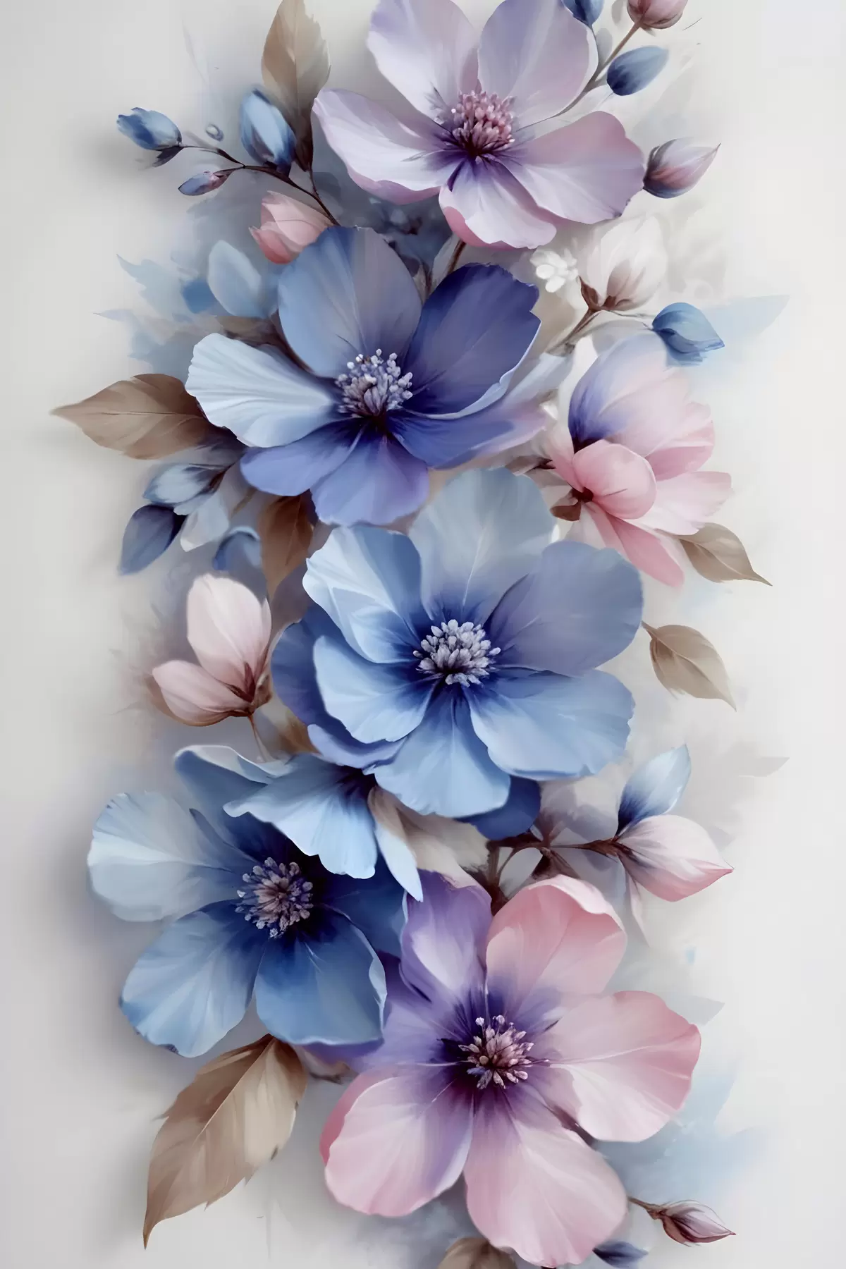 Cuadros Delicadas flores azules y rosas con suaves pétalos y centros, dispuestas en un bonito estampado floral sobre un fondo claro Nr s42241