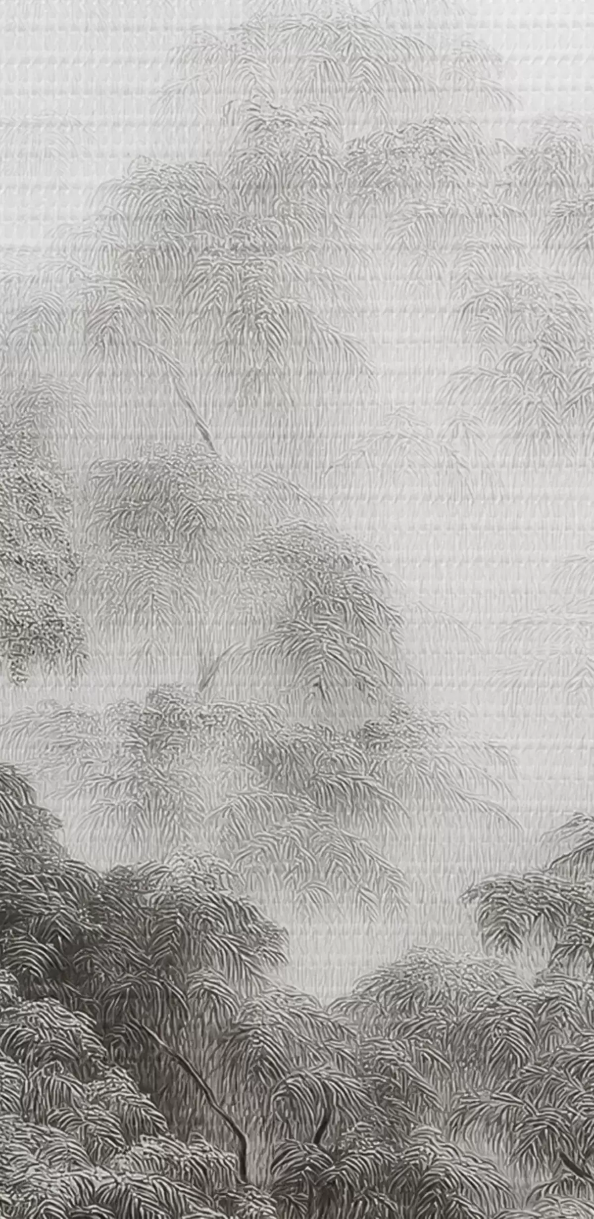 murales de pared Bosque tropical en la niebla, palmeras, colores grises s42371v1