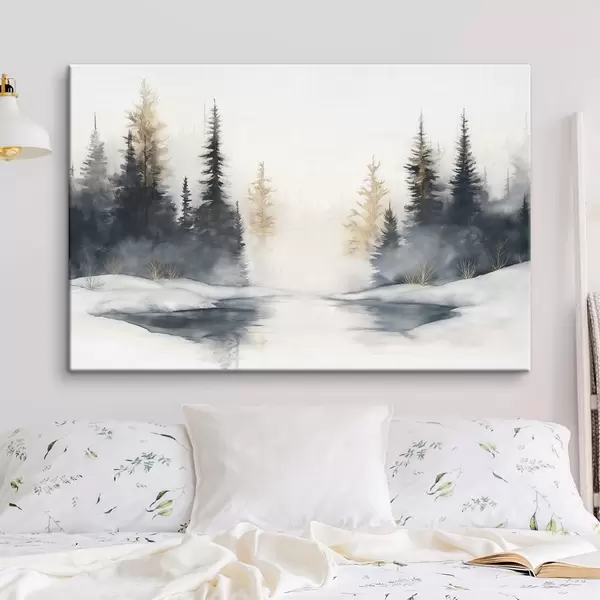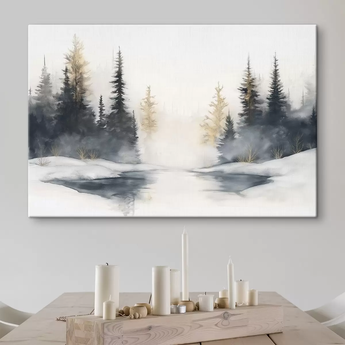Cuadros Paisaje de invierno con río y pinos, naturaleza, bosque, niebla Nr s42374