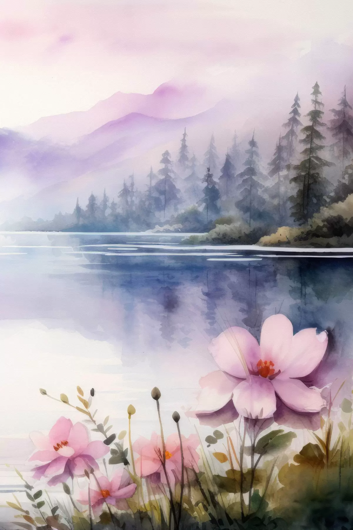 murales de pared Flores rosas sobre el fondo de un lago en las montañas s42393