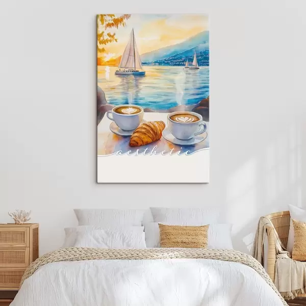 Cuadros Dos tazas de capuchino, estilo acuarela, puesta de sol en el mar, veleros, vocación Nr s42438