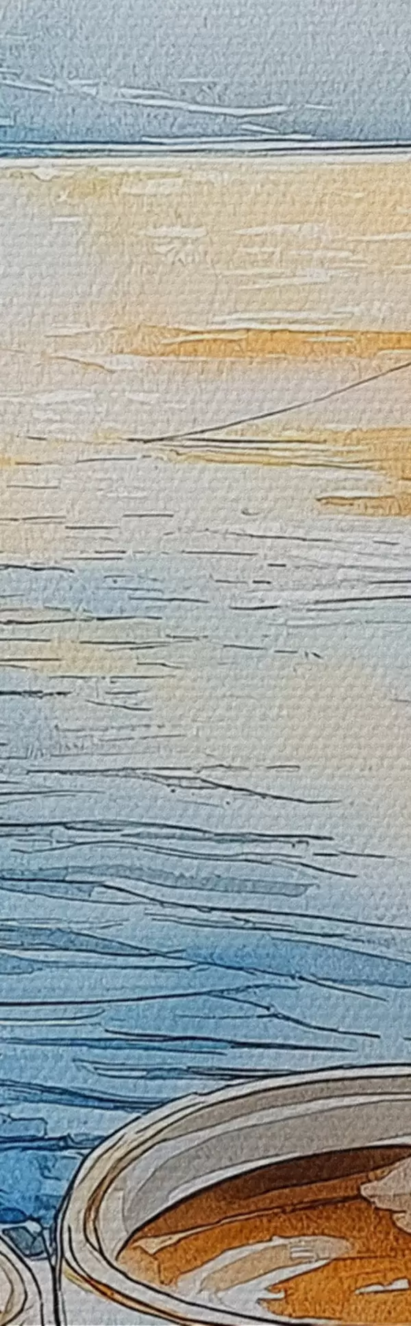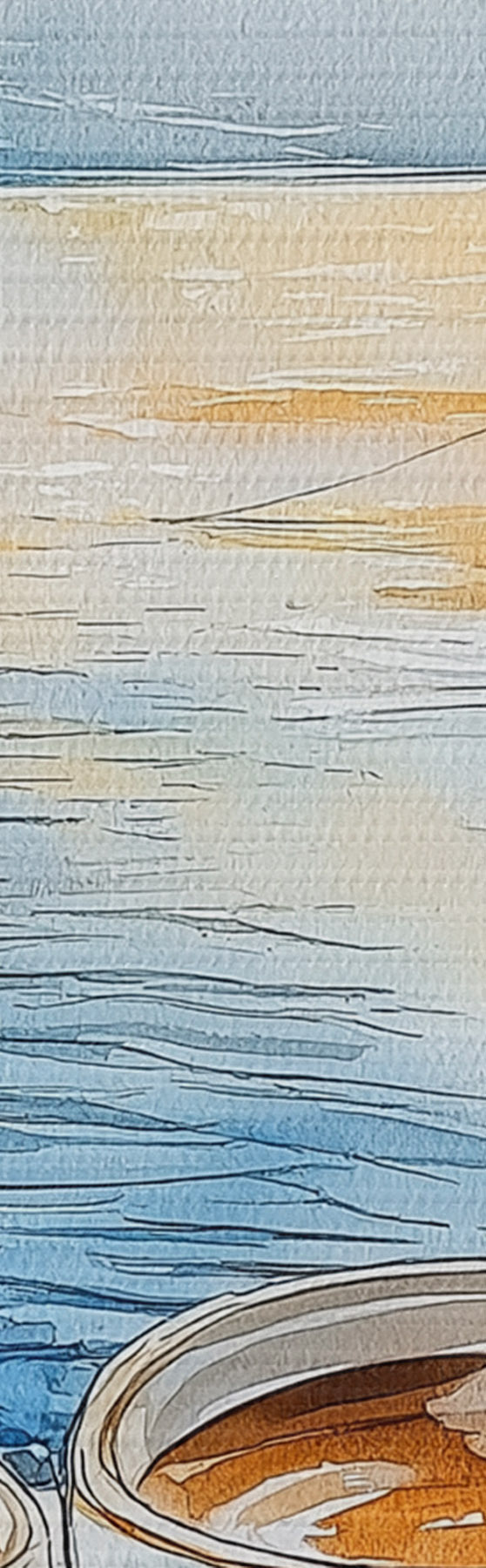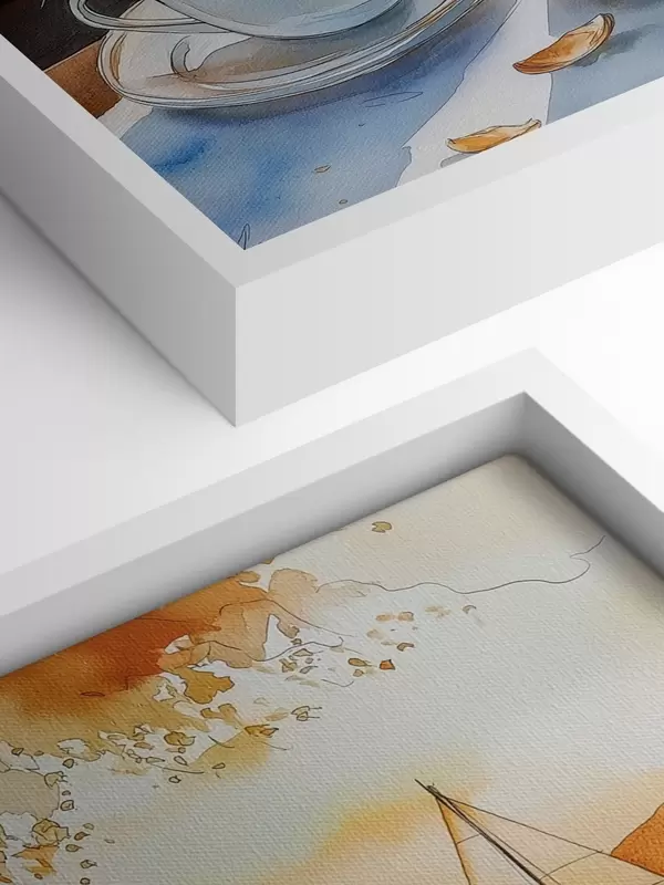 Cuadros Puesta de sol en el lago, veleros, tazas de café, estilo acuarela Nr s42442