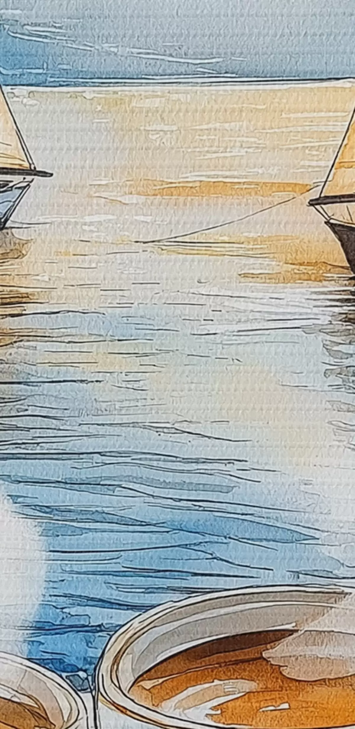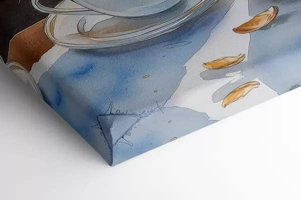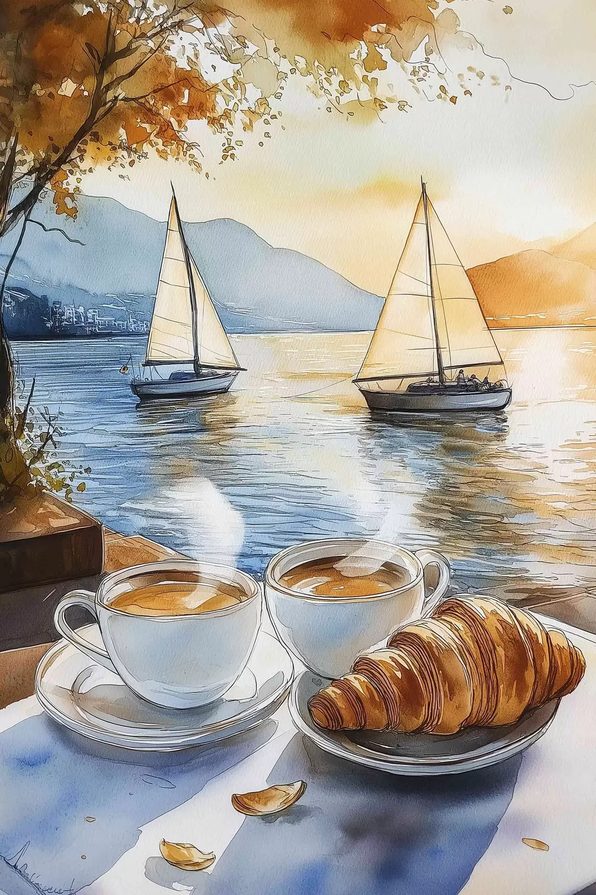 Cuadros Puesta de sol en el lago, veleros, tazas de café, estilo acuarela Nr s42442