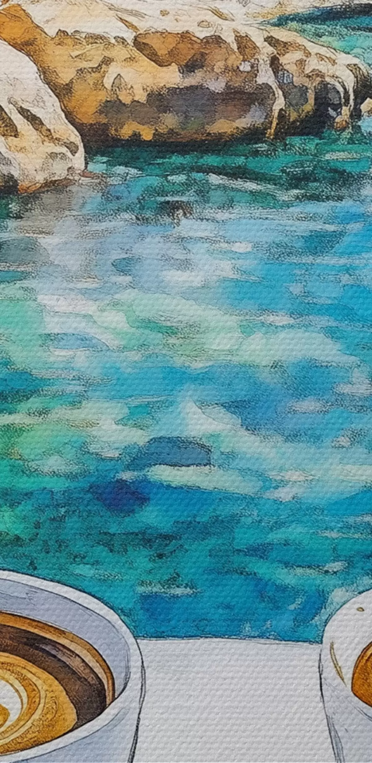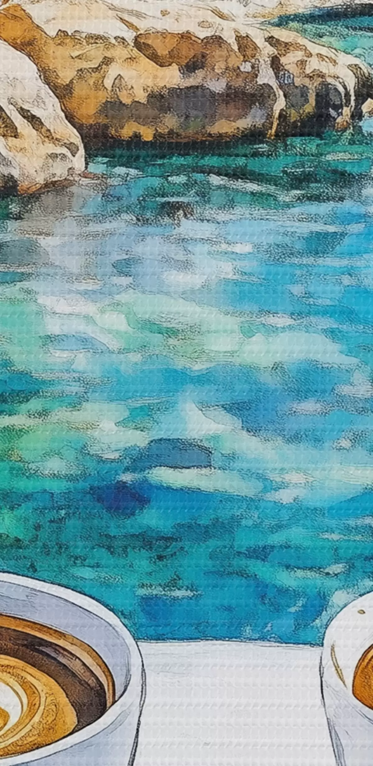 Cuadros Grecia estética, tazas de café, mar azul, casco antiguo, viajes Nr s42447