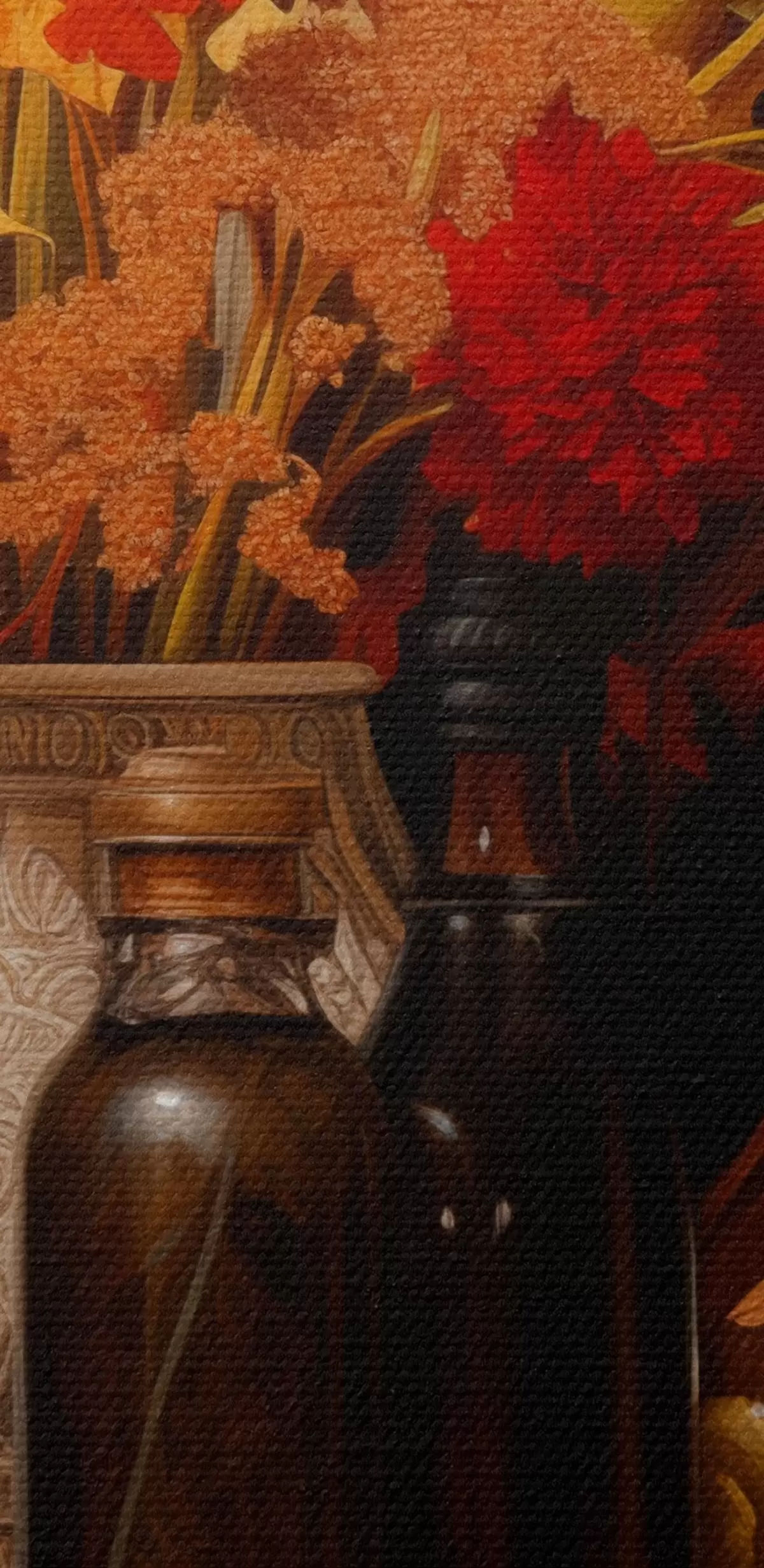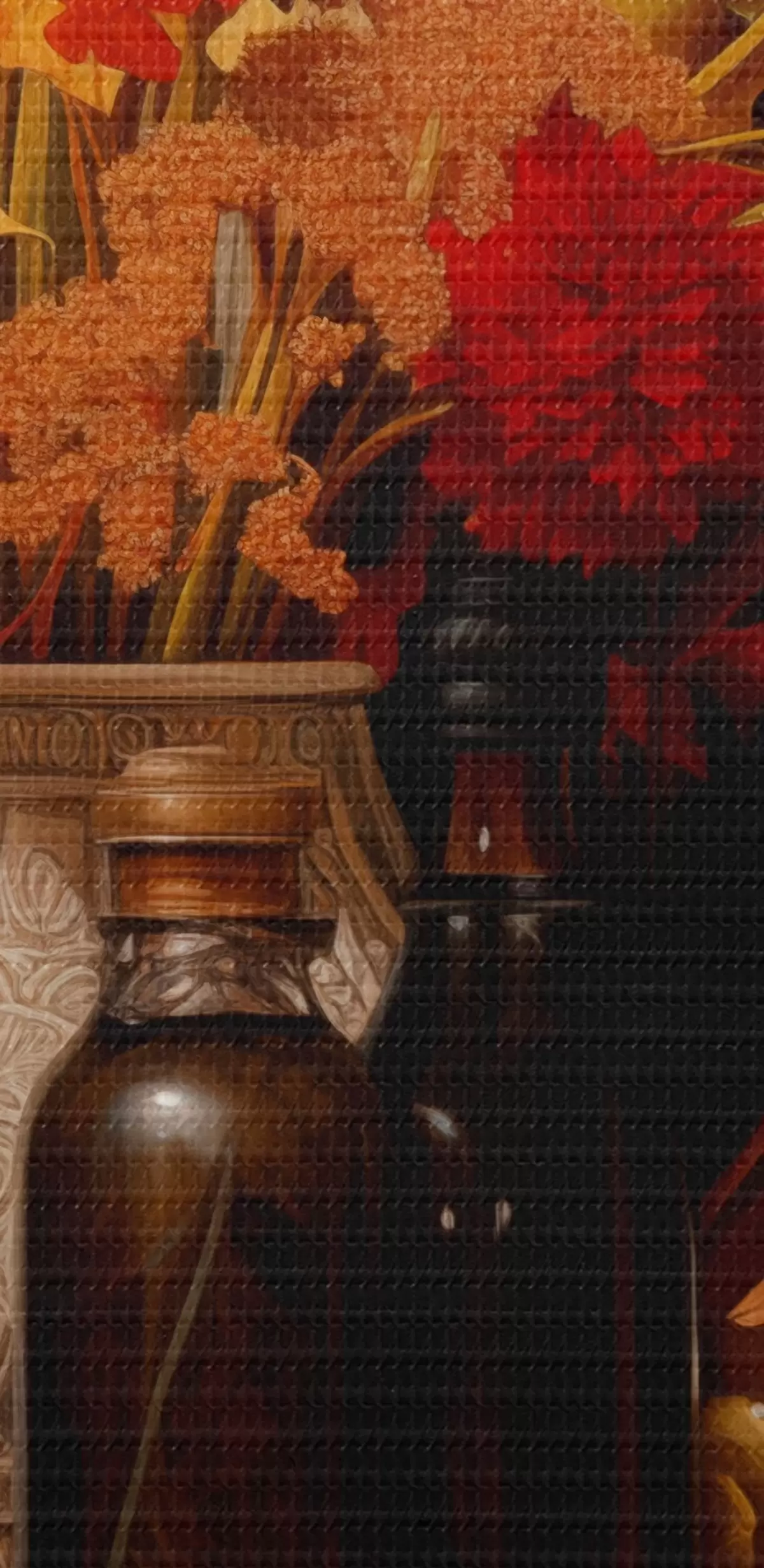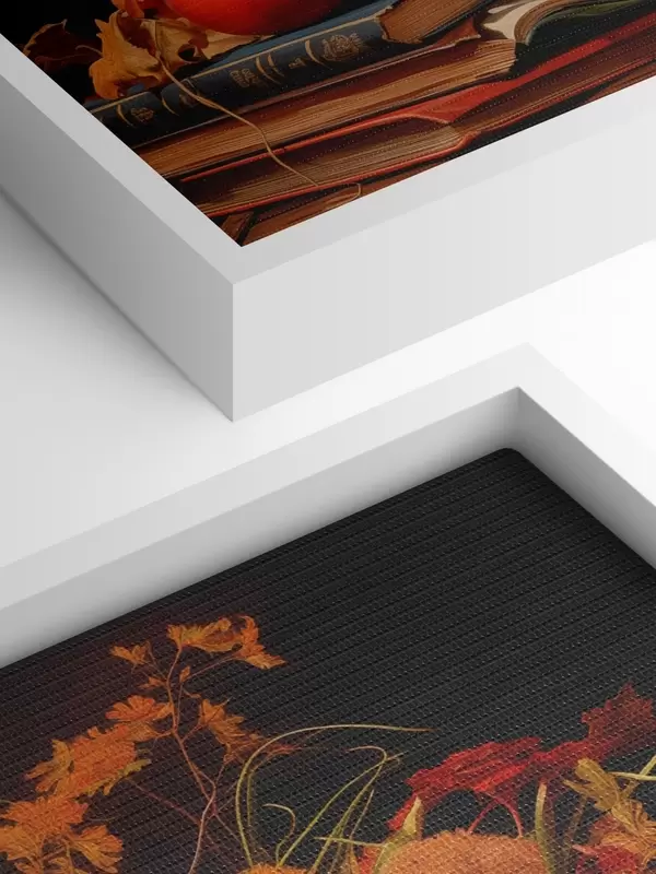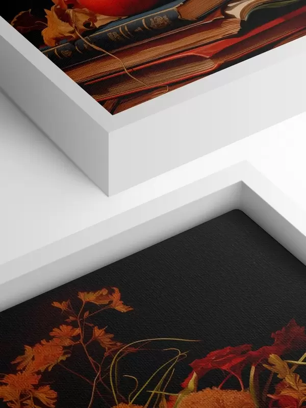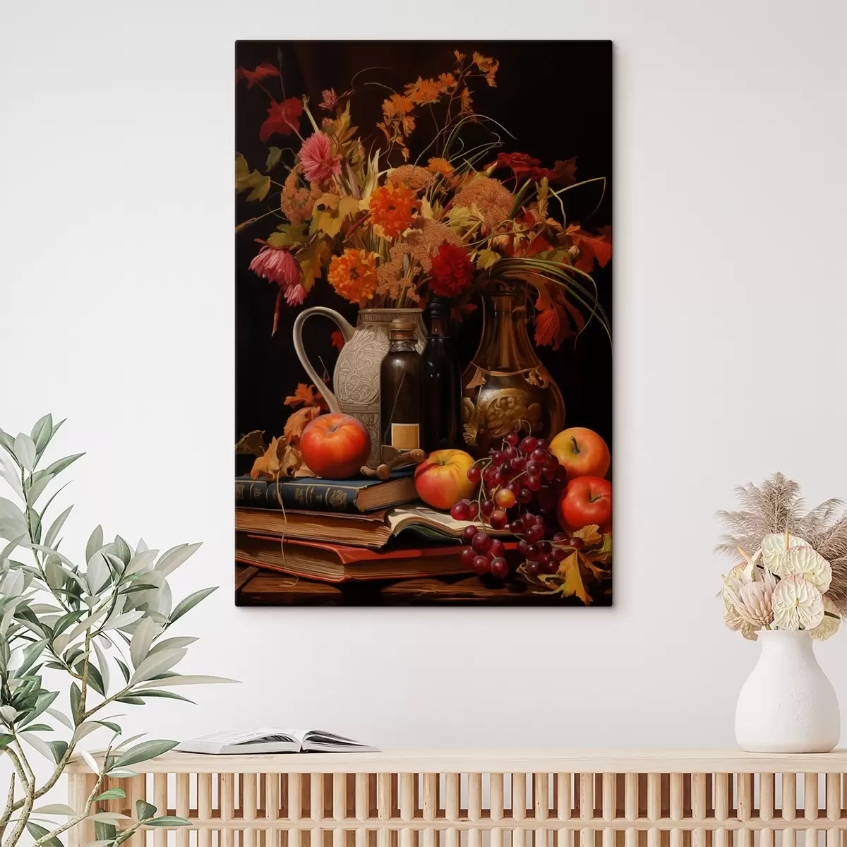 Cuadros Bodegón otoñal con un ramo de flores en cálidos tonos naranjas y rojos, manzanas, uvas, libros y platos de cerámica sobre fondo oscuro. Nr s42561