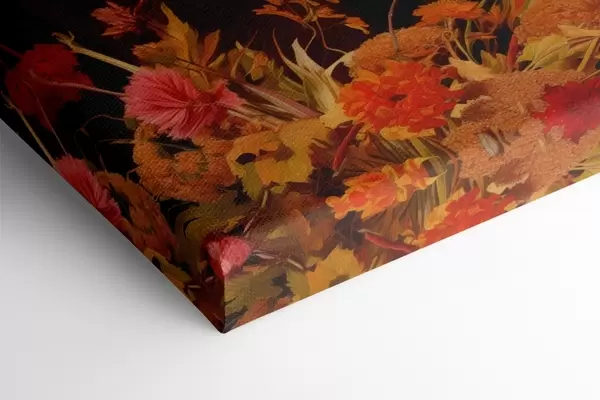 Cuadros Bodegón otoñal con un ramo de flores en cálidos tonos naranjas y rojos, manzanas, uvas, libros y platos de cerámica sobre fondo oscuro Nr s42561