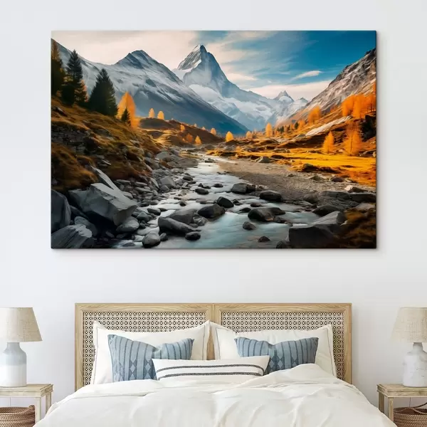 Cuadros Un paisaje otoñal de montaña con un río rápido, árboles dorados y un pico majestuoso contra un cielo brillante. Nr s42564