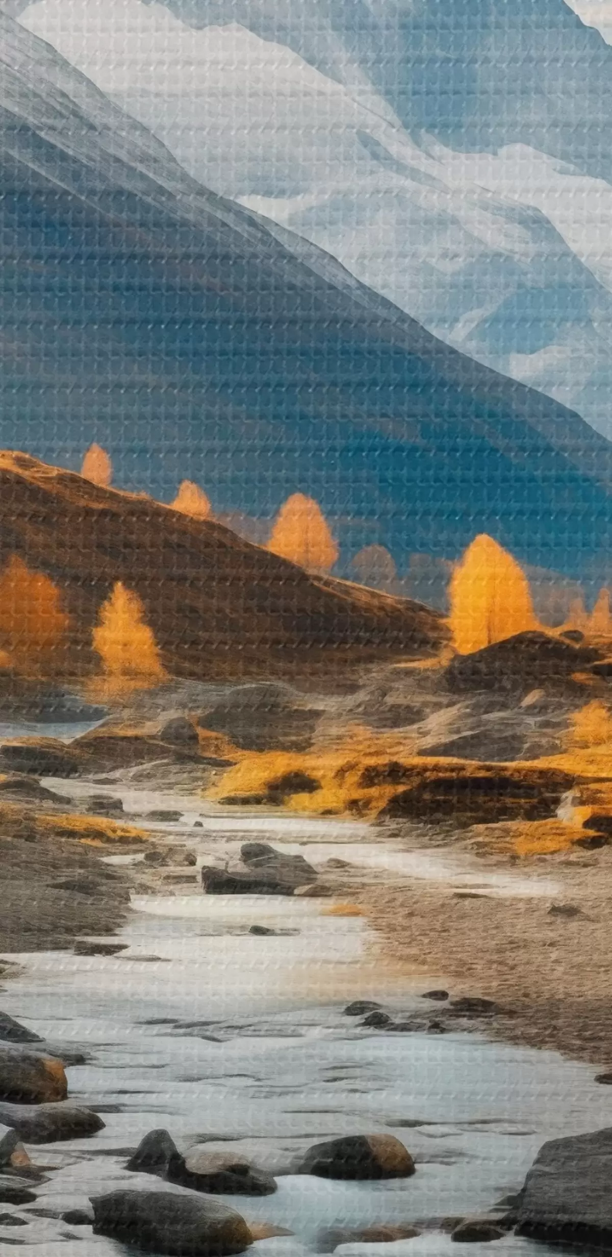 Cuadros Un paisaje otoñal de montaña con un río rápido, árboles dorados y un pico majestuoso contra un cielo brillante. Nr s42564