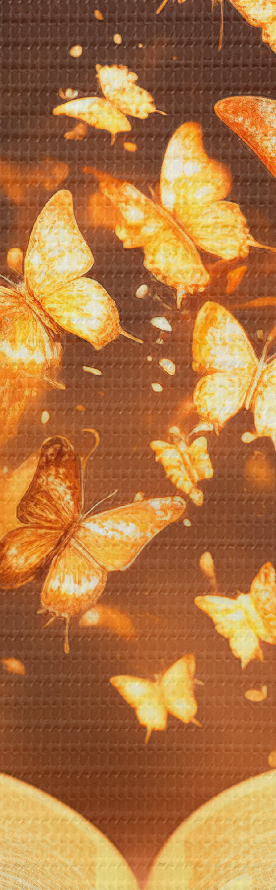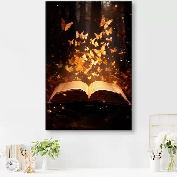 Cuadros Un libro abierto del que surgen mariposas luminosas que brillan en rayos de luz en un bosque oscuro y mágico. Nr s42573