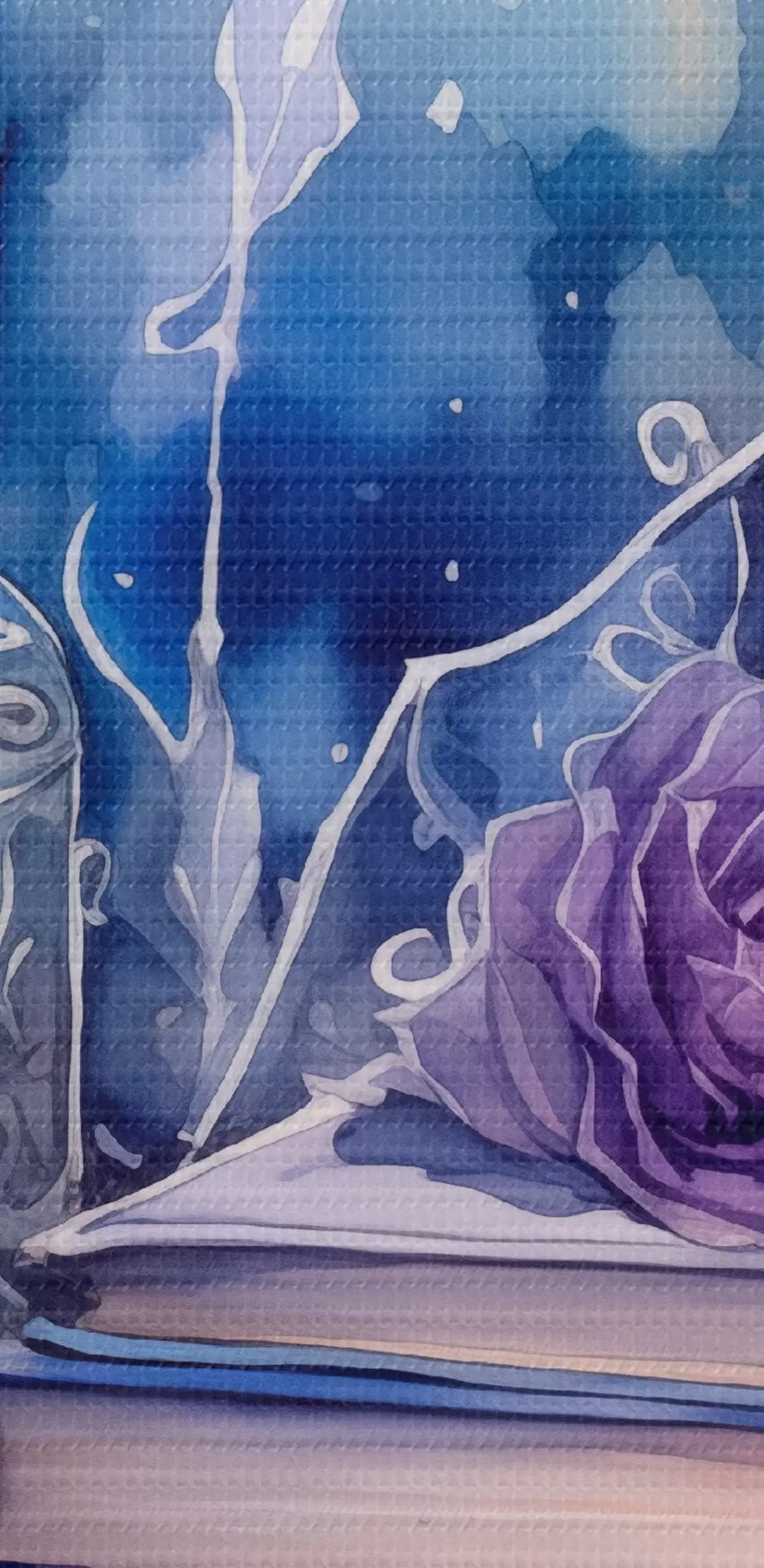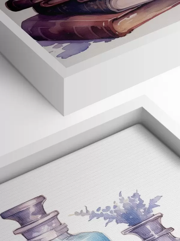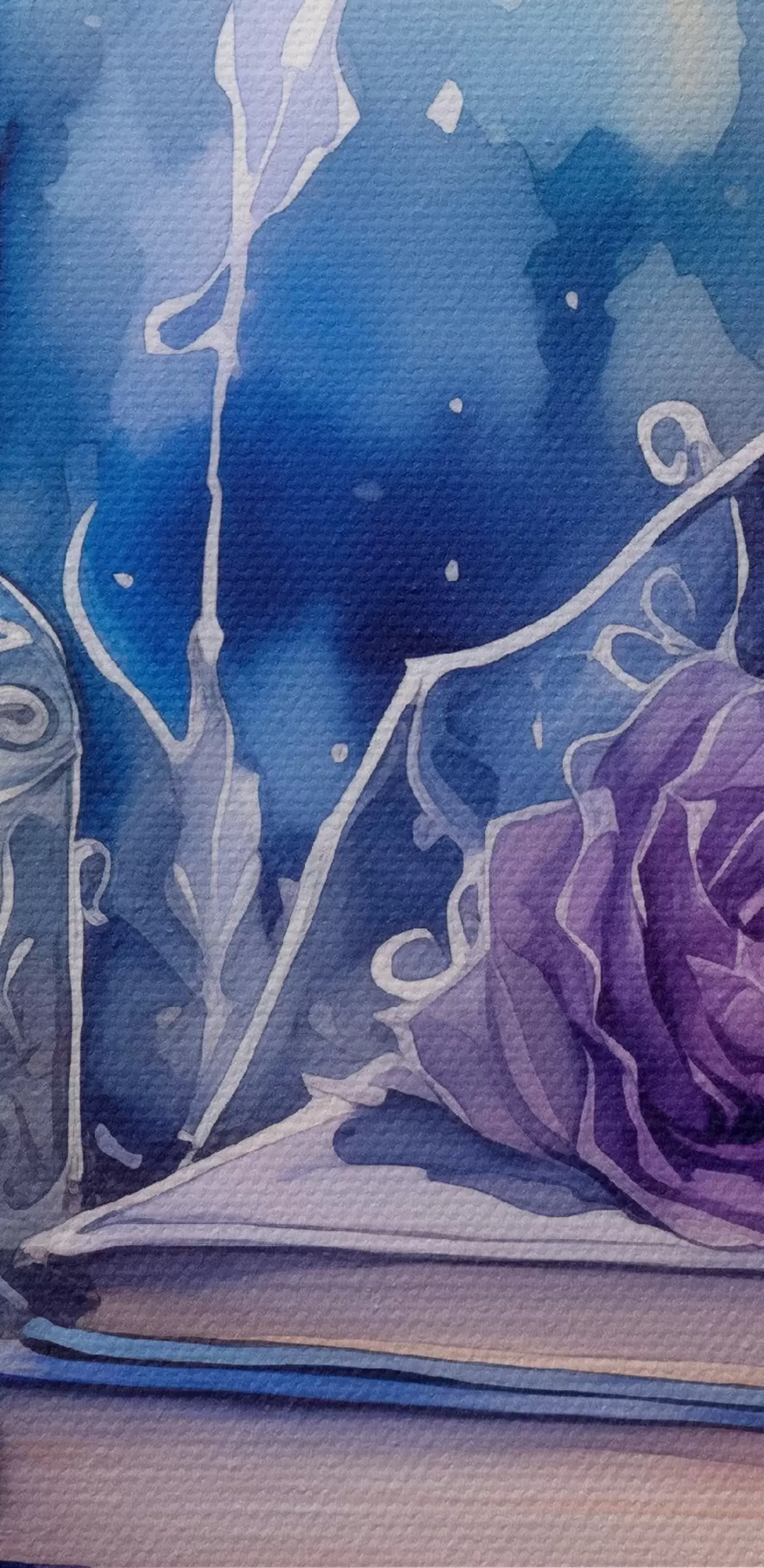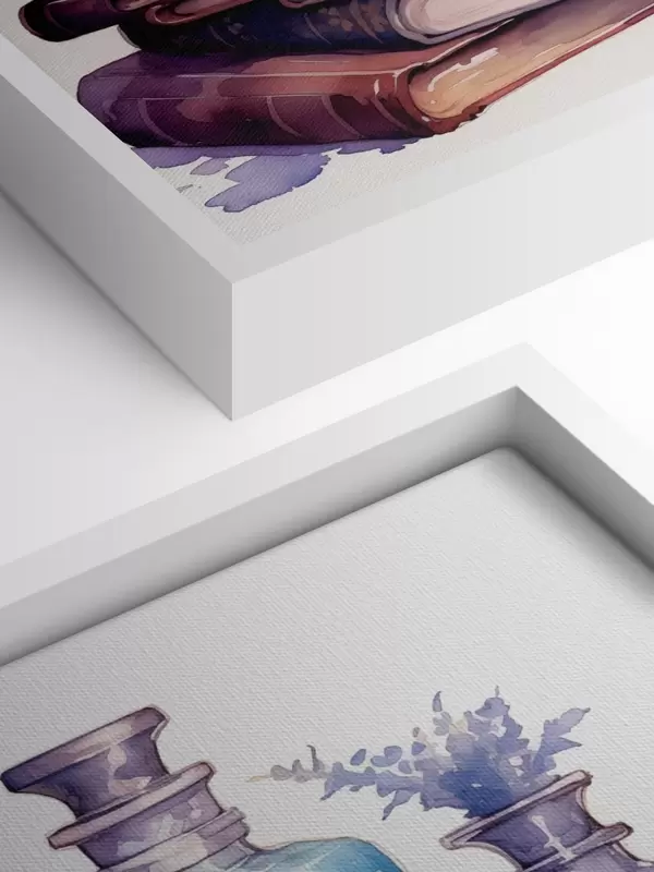 Cuadros Un bodegón con libros vintage, botellas de cristal en tonos azul-violeta y flores decorativas. Nr s42574
