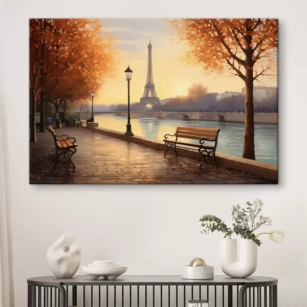 Cuadros Otoño en París con vistas a la Torre Eiffel, el Sena cubierto de hojas doradas, bancos y farolas que añaden un ambiente romántico Nr s42577