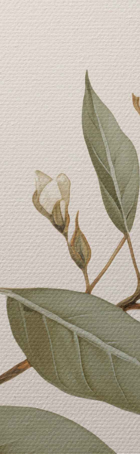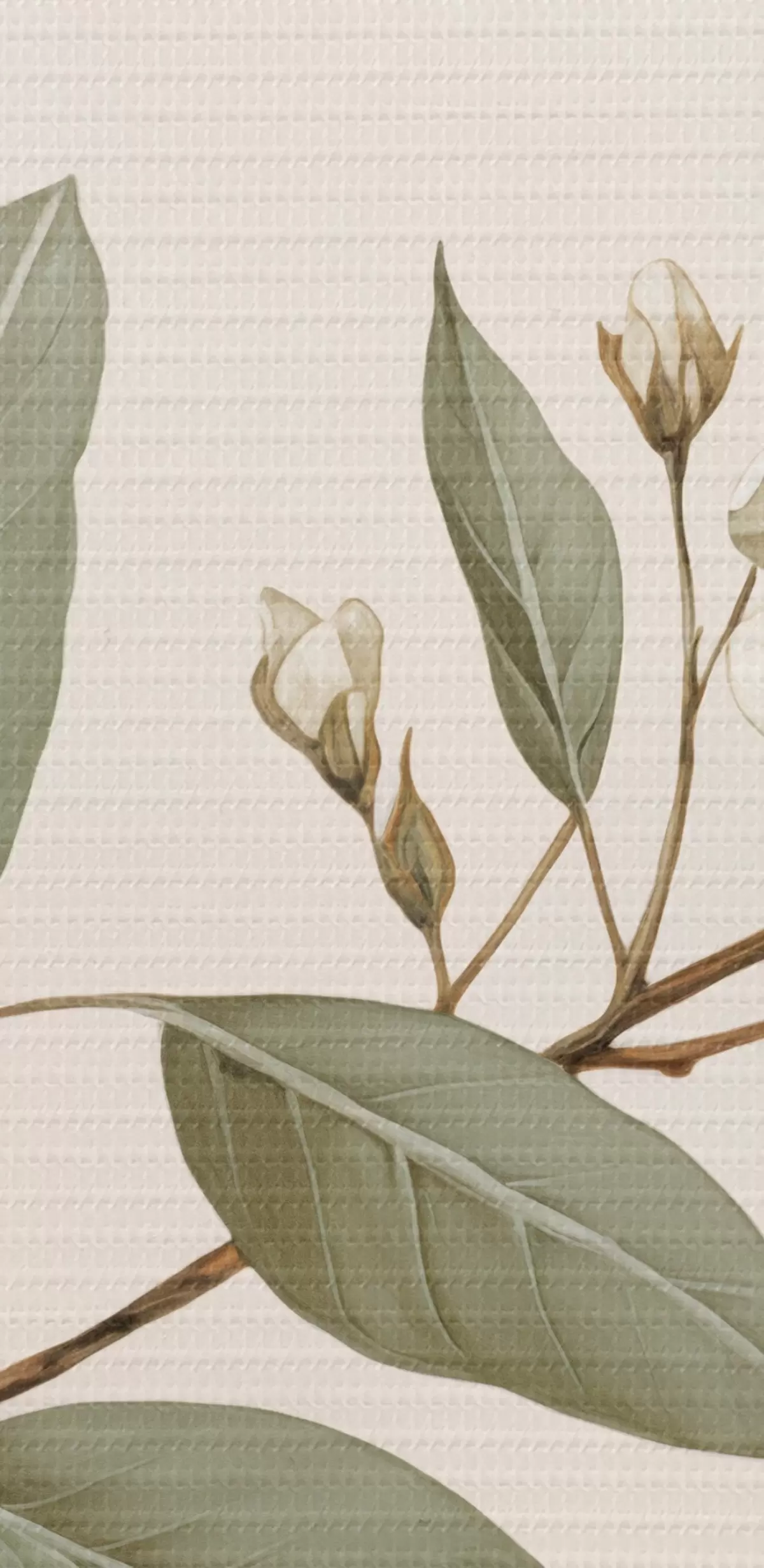 murales de pared Una delicada rama con flores blancas y hojas verdes sobre un fondo claro, con detalles suaves y un estilo elegante. s42583