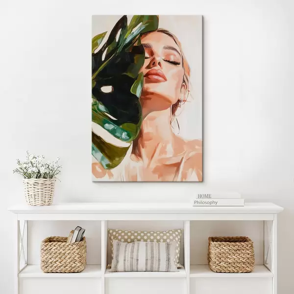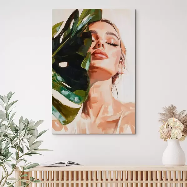 Cuadros Retrato de mujer con una hoja de monstera con pinceladas de imitación Nr s42597