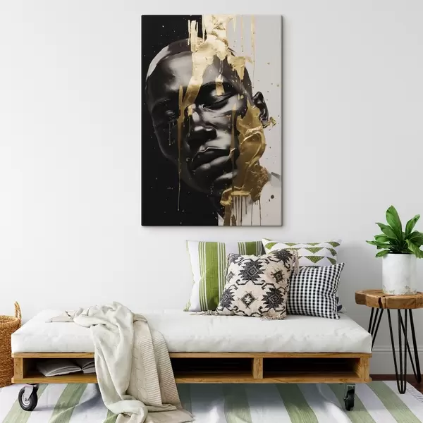 murales de pared Retrato abstracto de un hombre en suaves tonos blanco y negro, realzados por brillantes pinceladas de colores cálidos que crean un efecto dinámico. s42623
