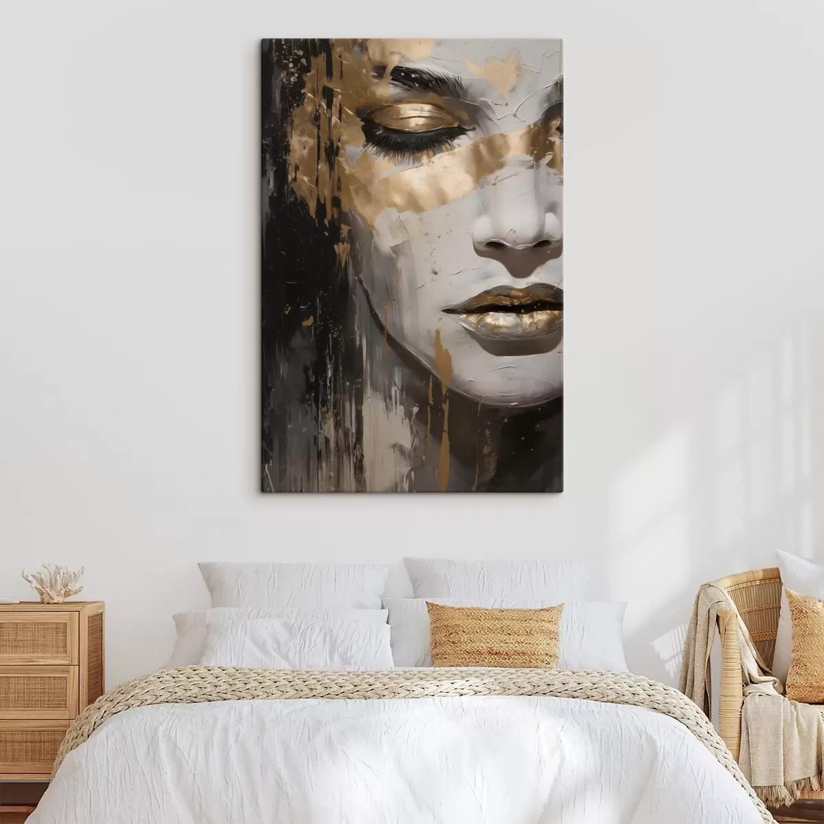 murales de pared Retrato abstracto de una mujer en el que destacan los ojos y los labios cerrados, realizado en tonos blanco y negro con dinámicas pinceladas de colores cálidos. s42626