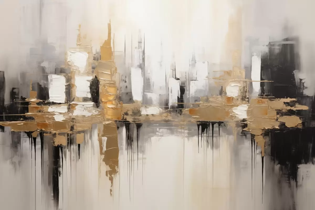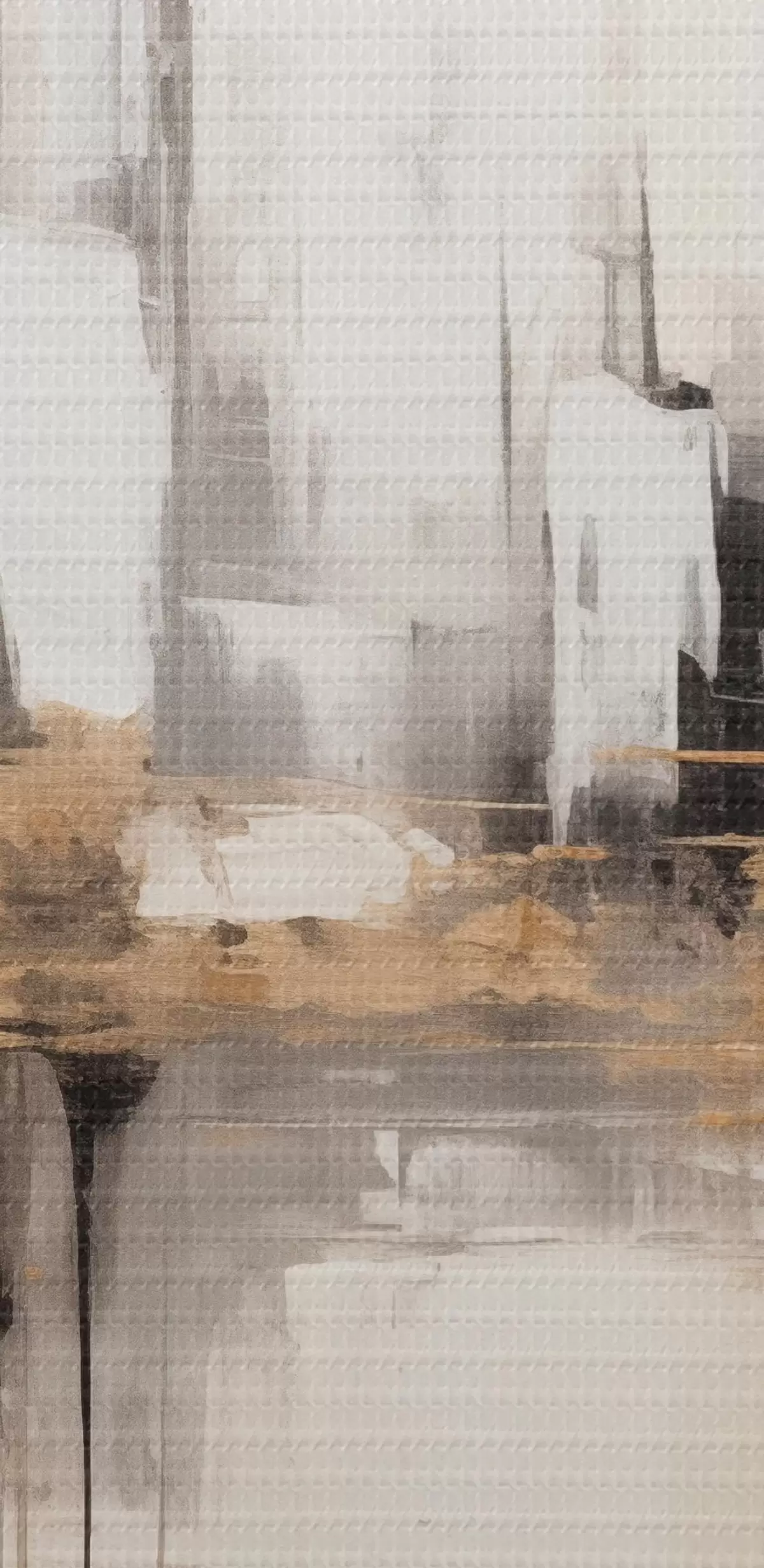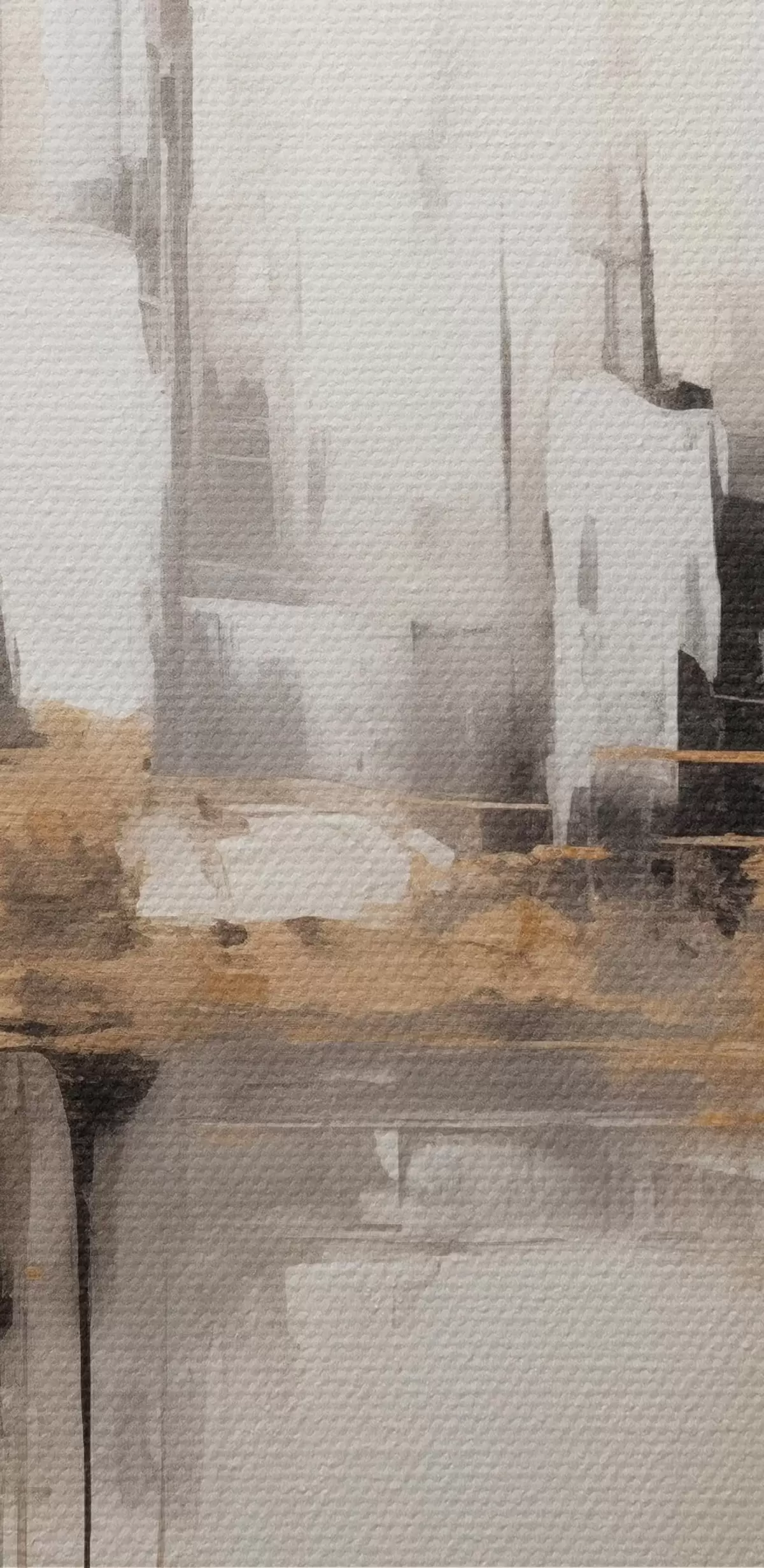 Cuadros Un paisaje urbano abstracto con reflejos de edificios en el agua, creado en tonos neutros con acentos de tonos cálidos. Nr s42628