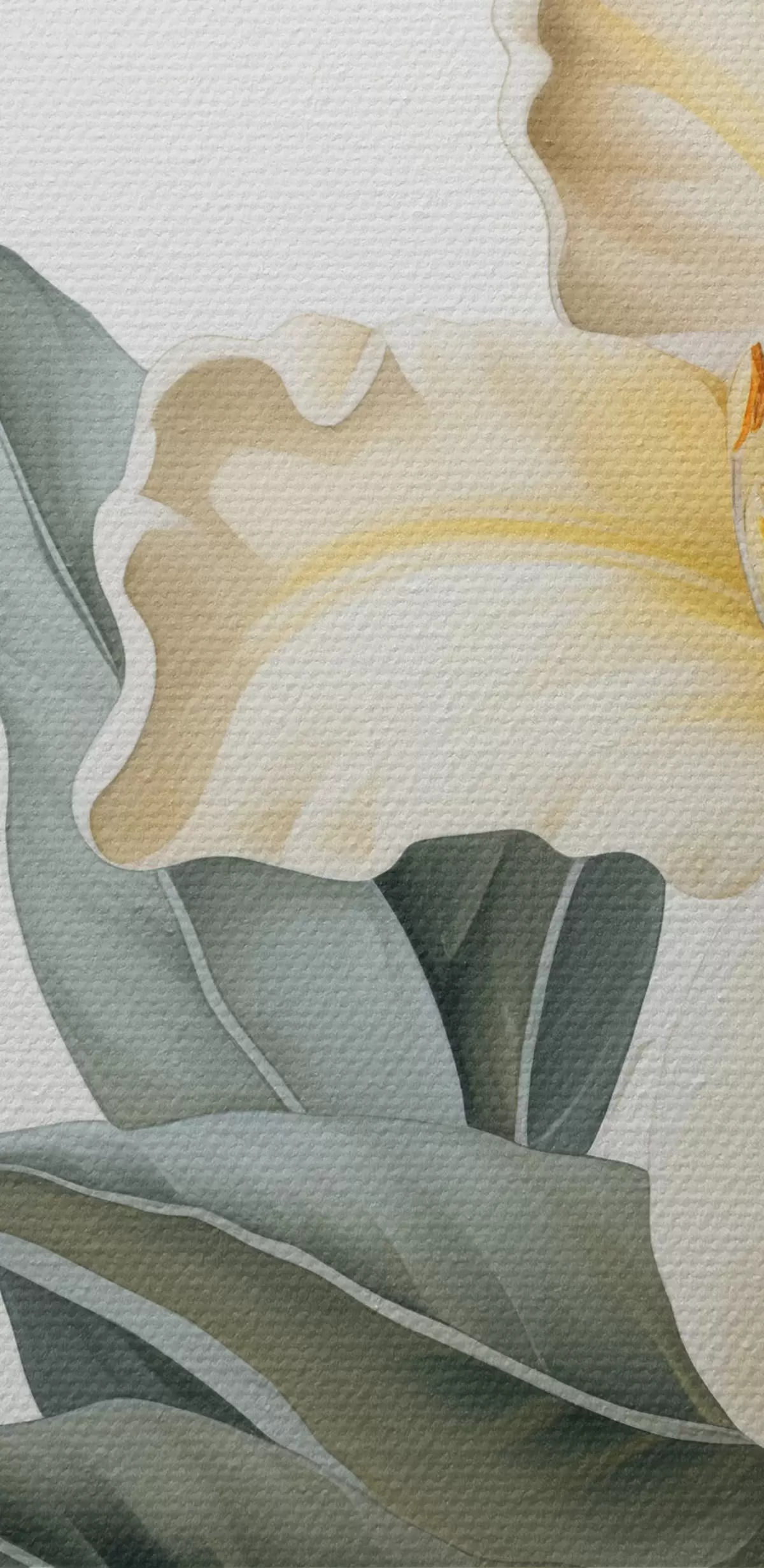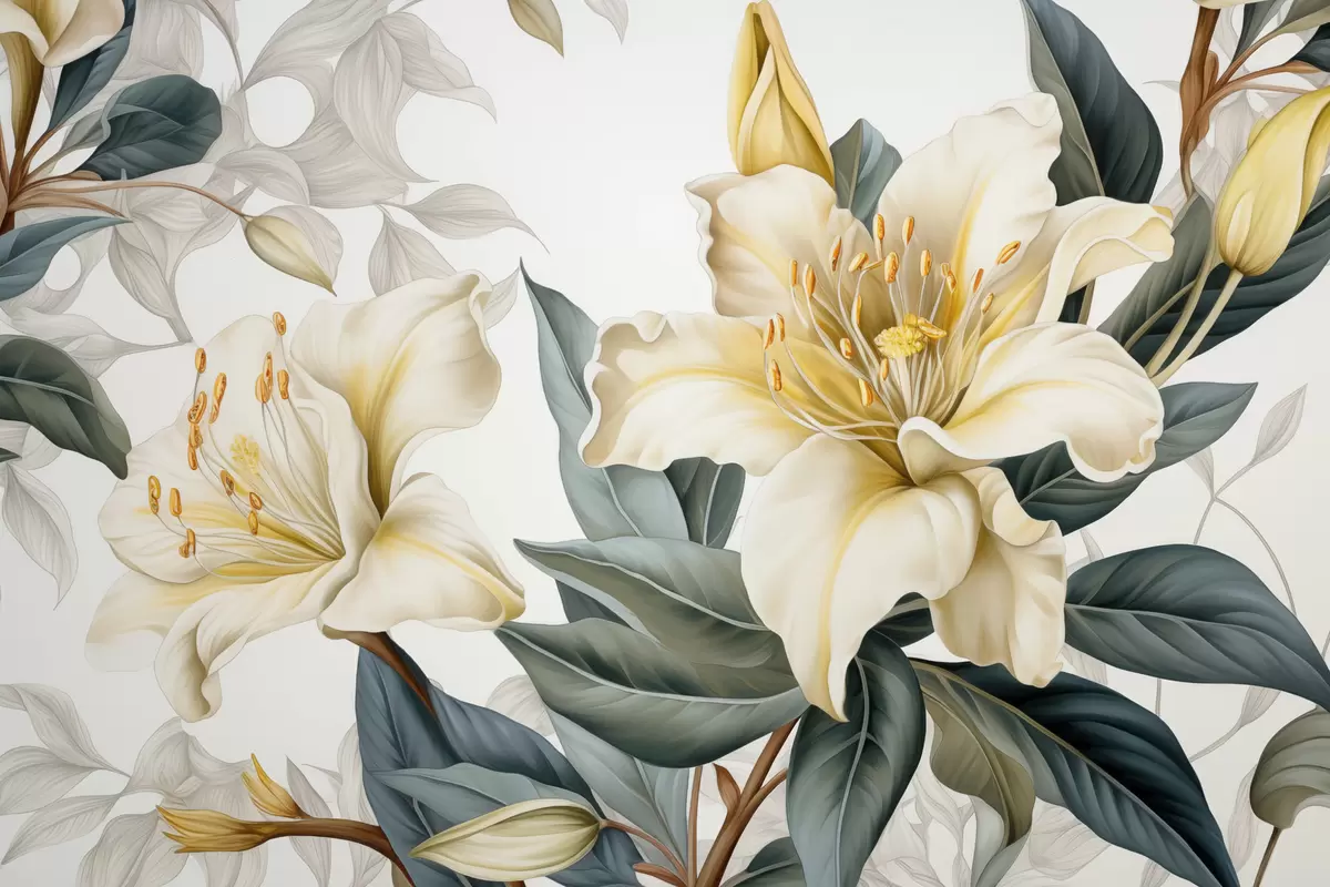 murales de pared Ilustración botánica de flores blancas y amarillo pálido con intrincados pétalos, rodeadas de hojas verdes s42712