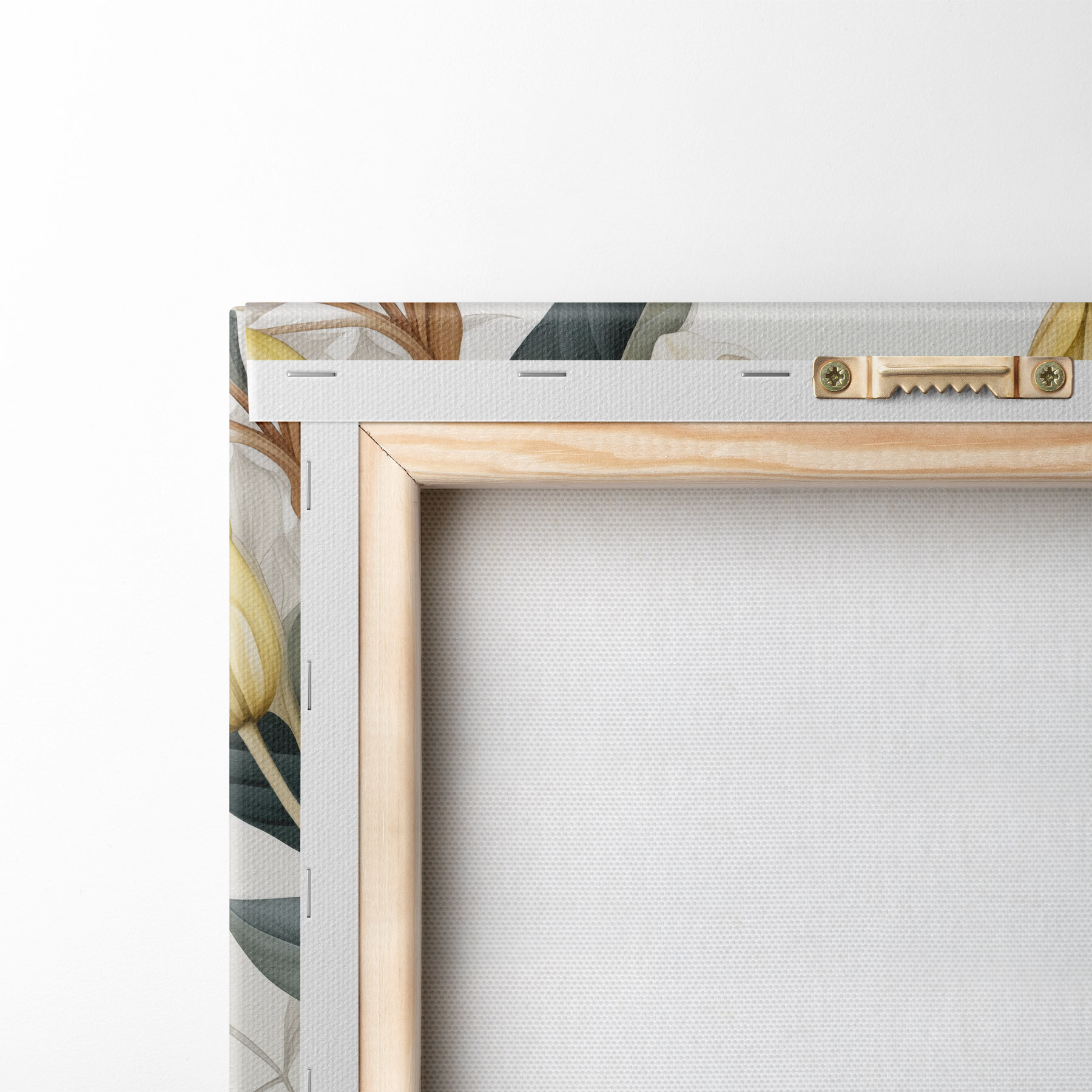 Cuadros Ilustración botánica de flores blancas y amarillo pálido con intrincados pétalos, rodeadas de hojas verdes Nr s42712