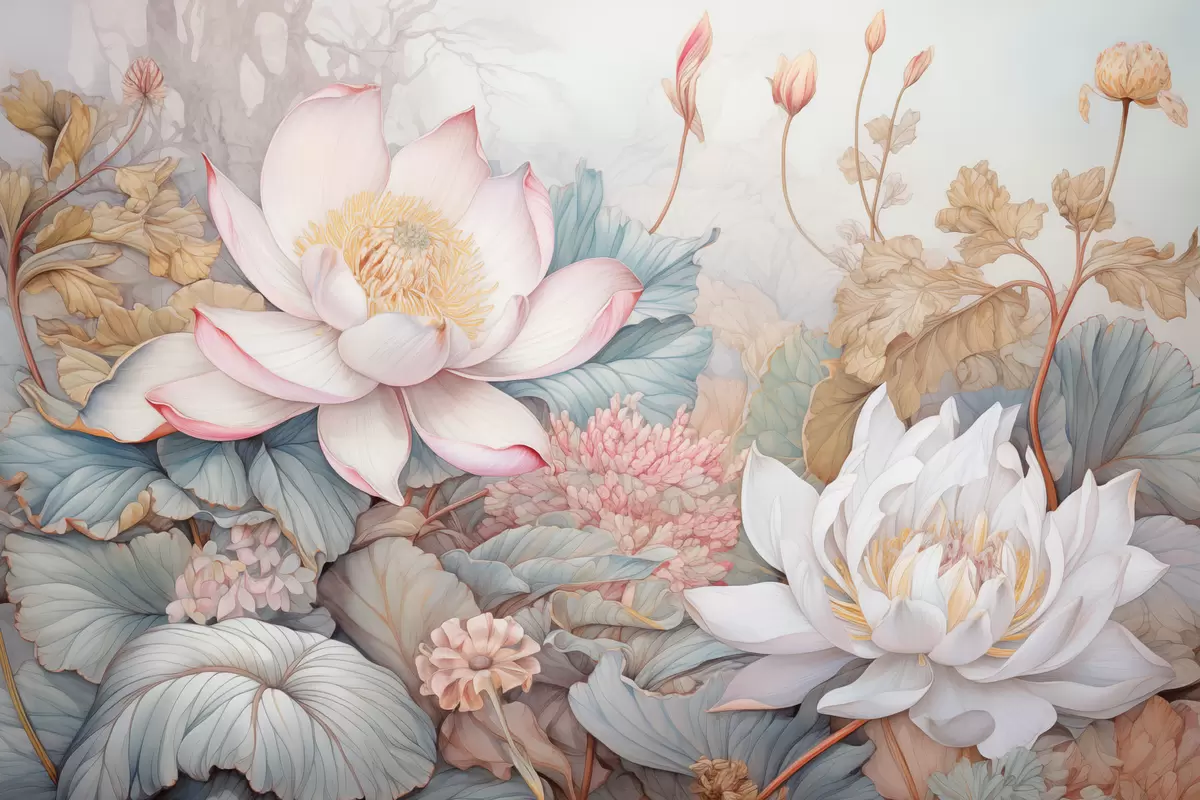 murales de pared Grandes flores de loto en tonos rosas y blancos, rodeadas de hojas verdes y un delicado follaje rosa s42729