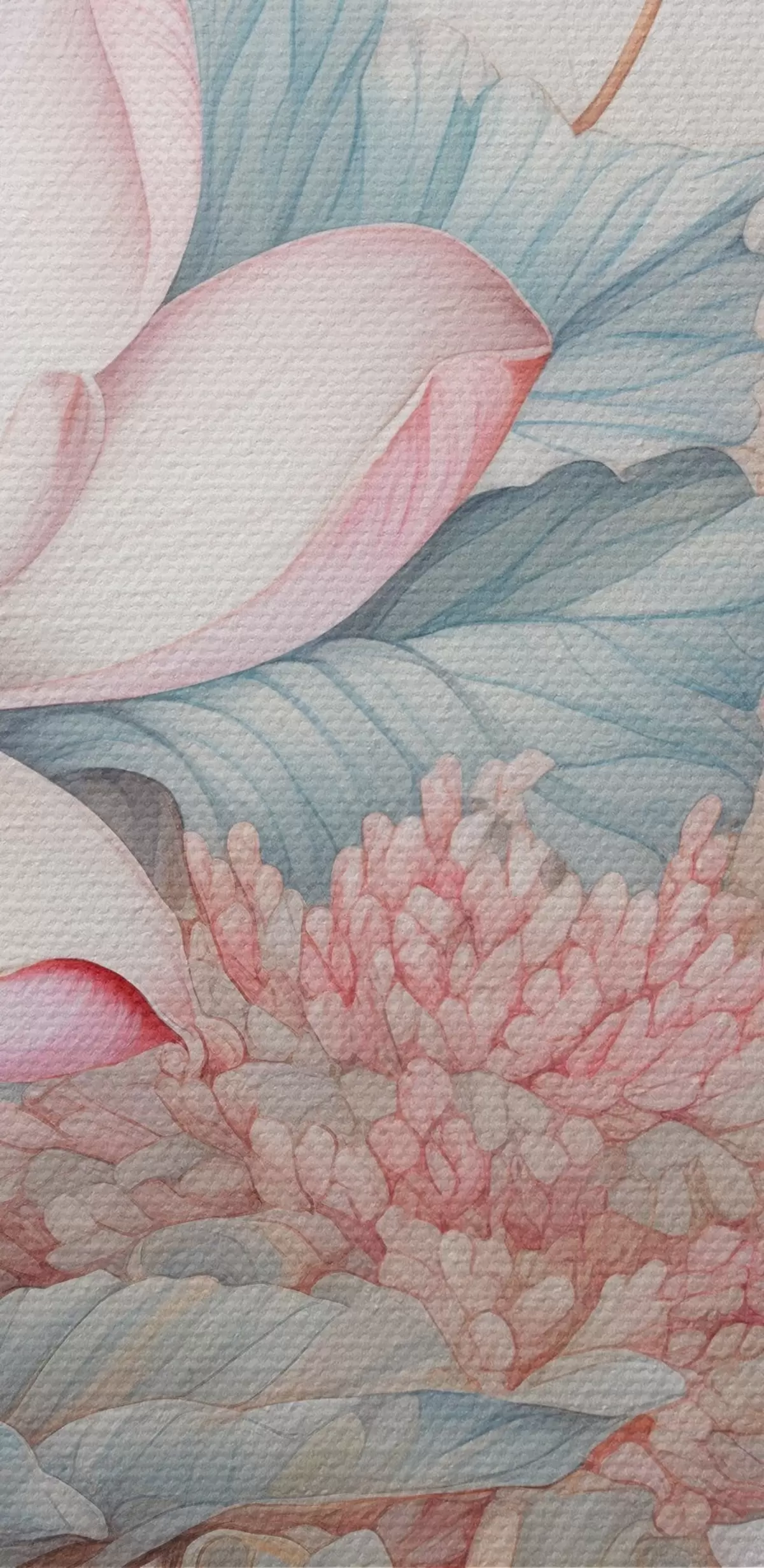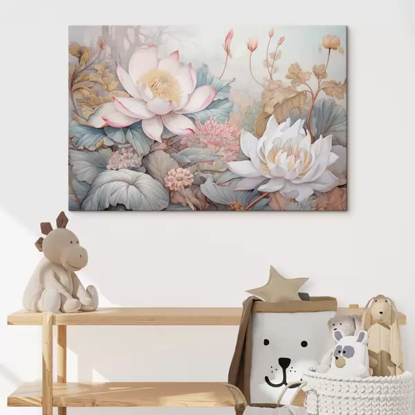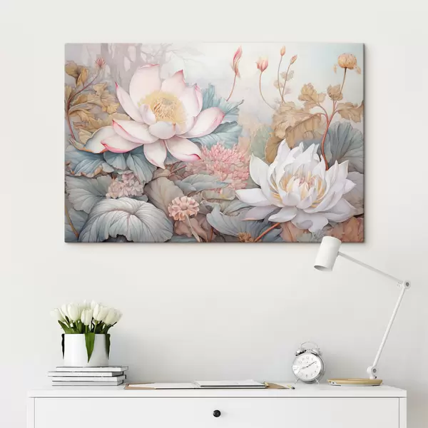 Cuadros Grandes flores de loto en tonos rosas y blancos, rodeadas de hojas verdes y un delicado follaje rosa Nr s42729