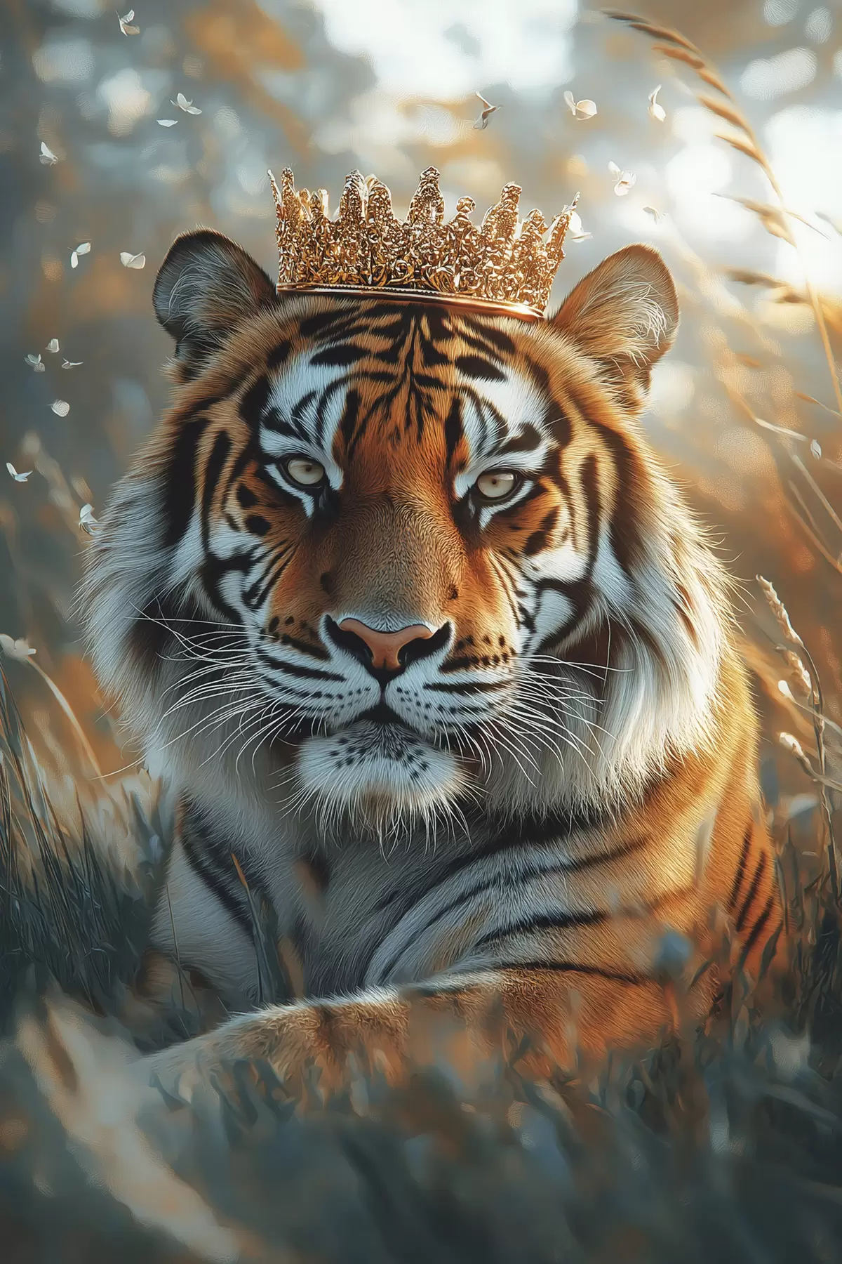 murales de pared Hermoso tigre con corona de oro, prado de verano, realismo s42786